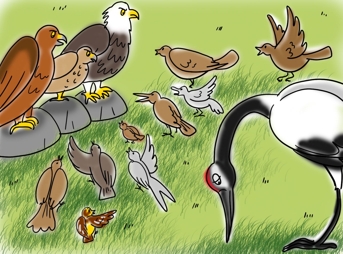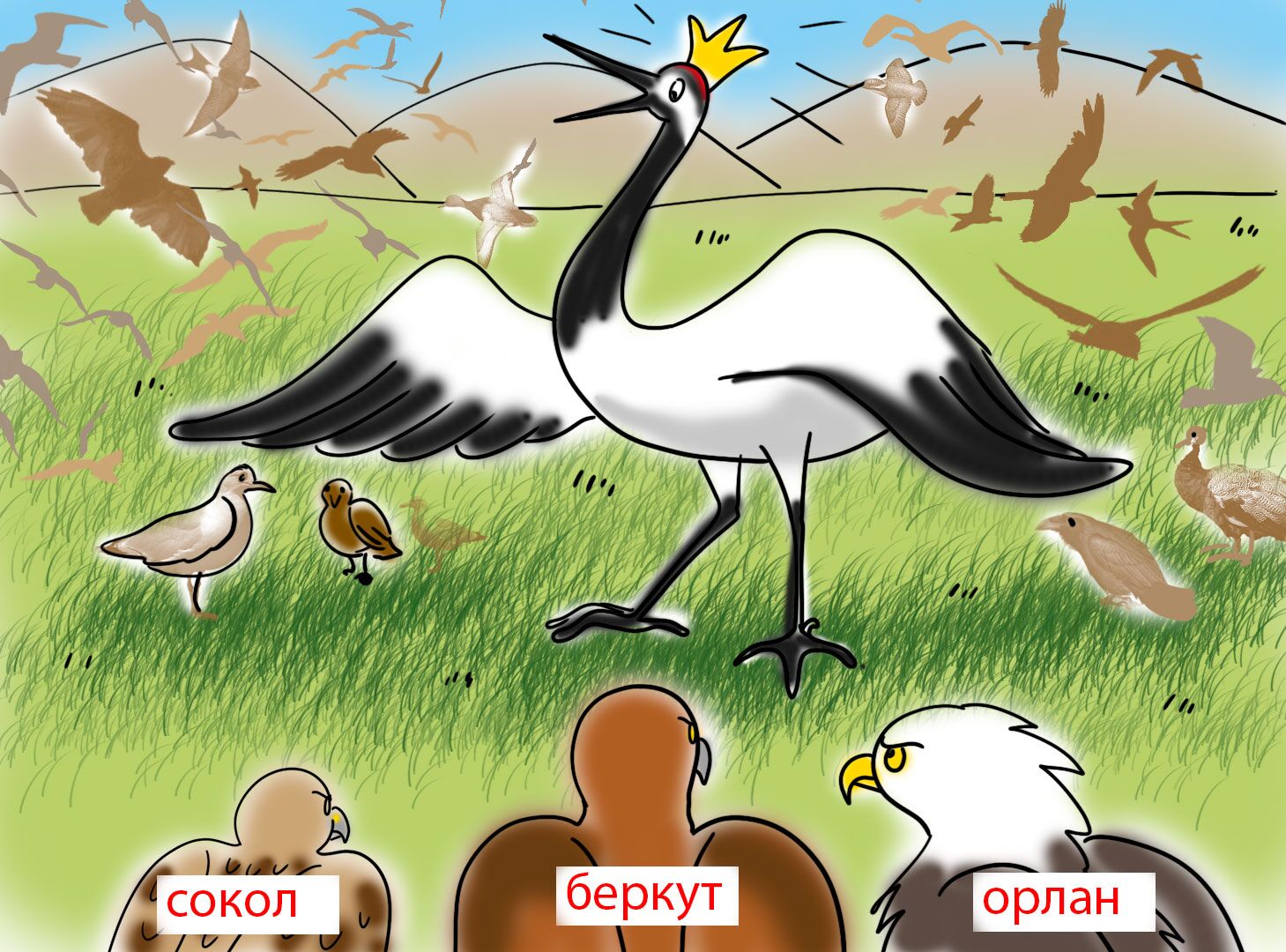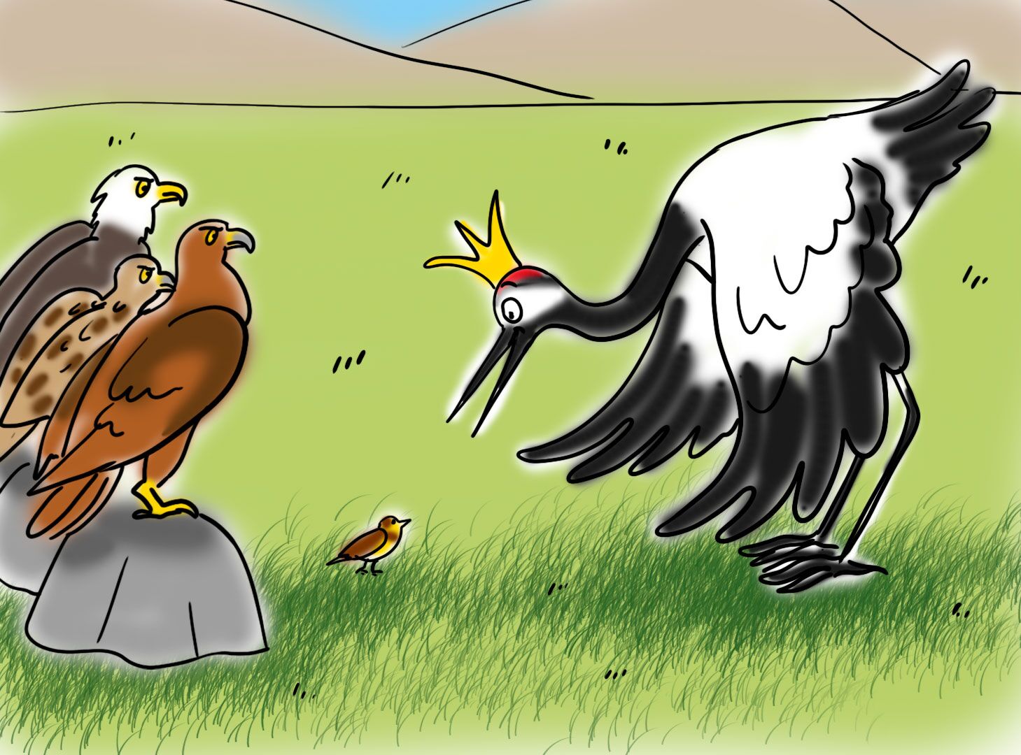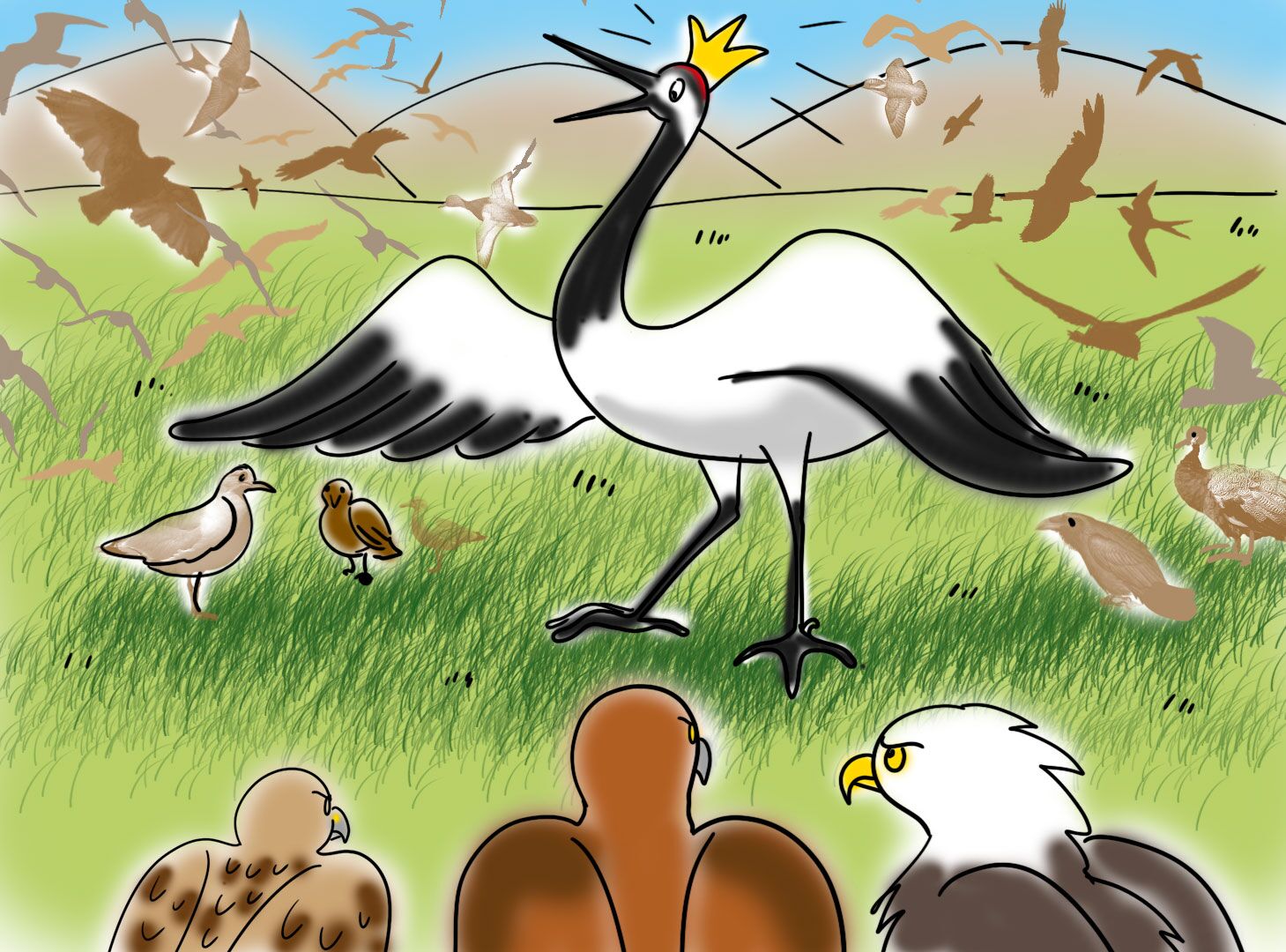 История о том, как царственный журавль плохо поступил с одной маленькой птичкой и чем это закончилось.