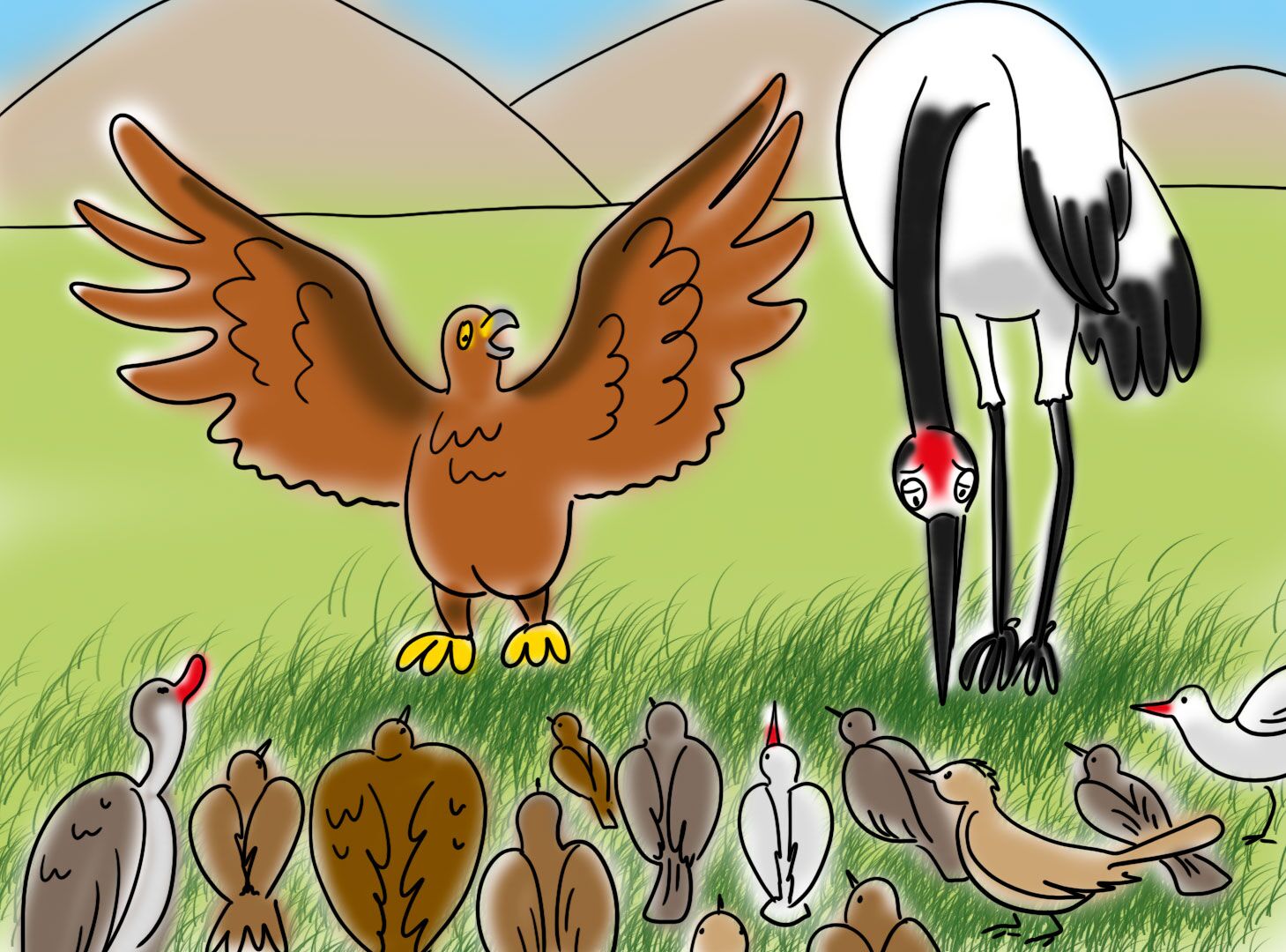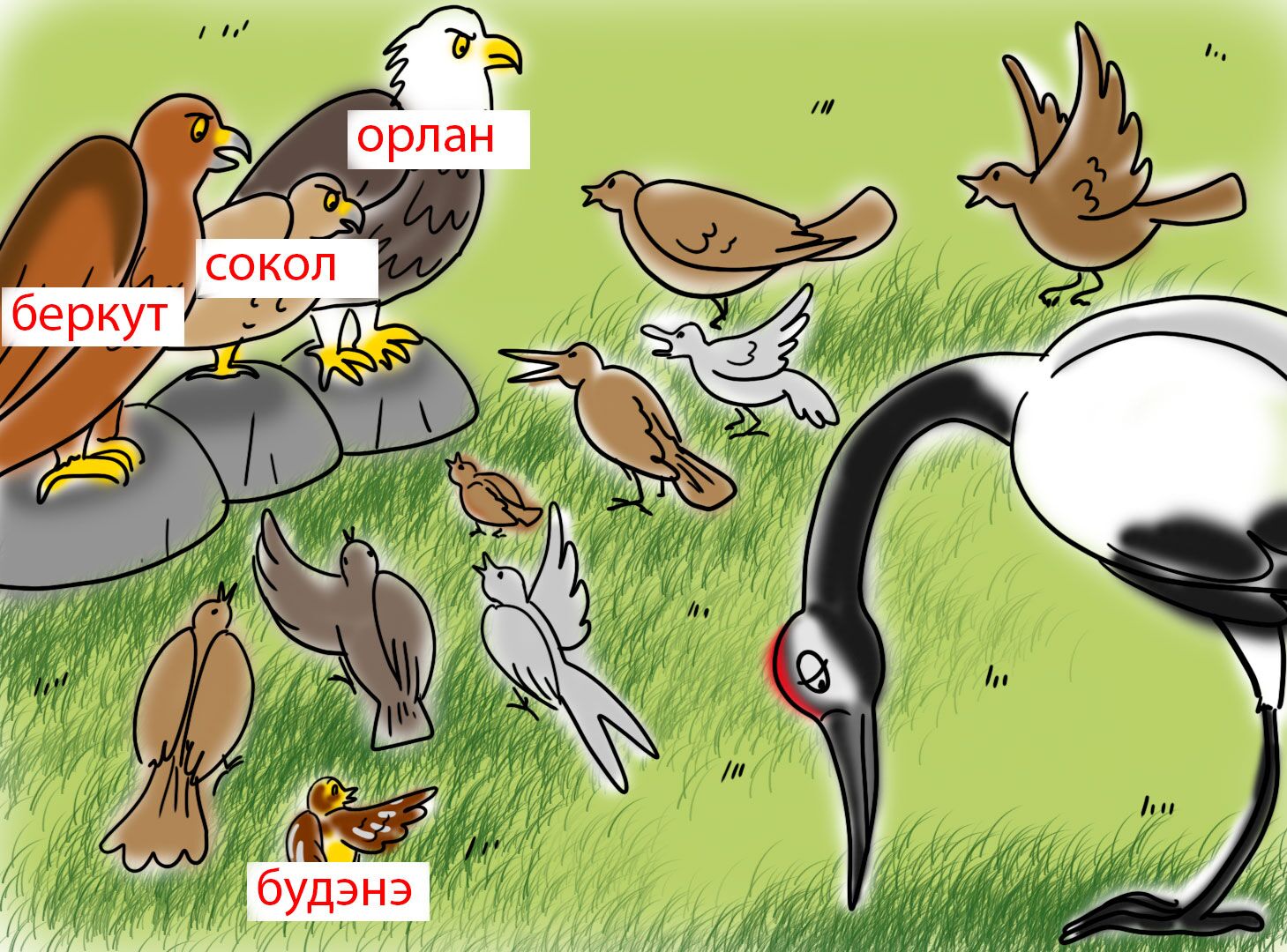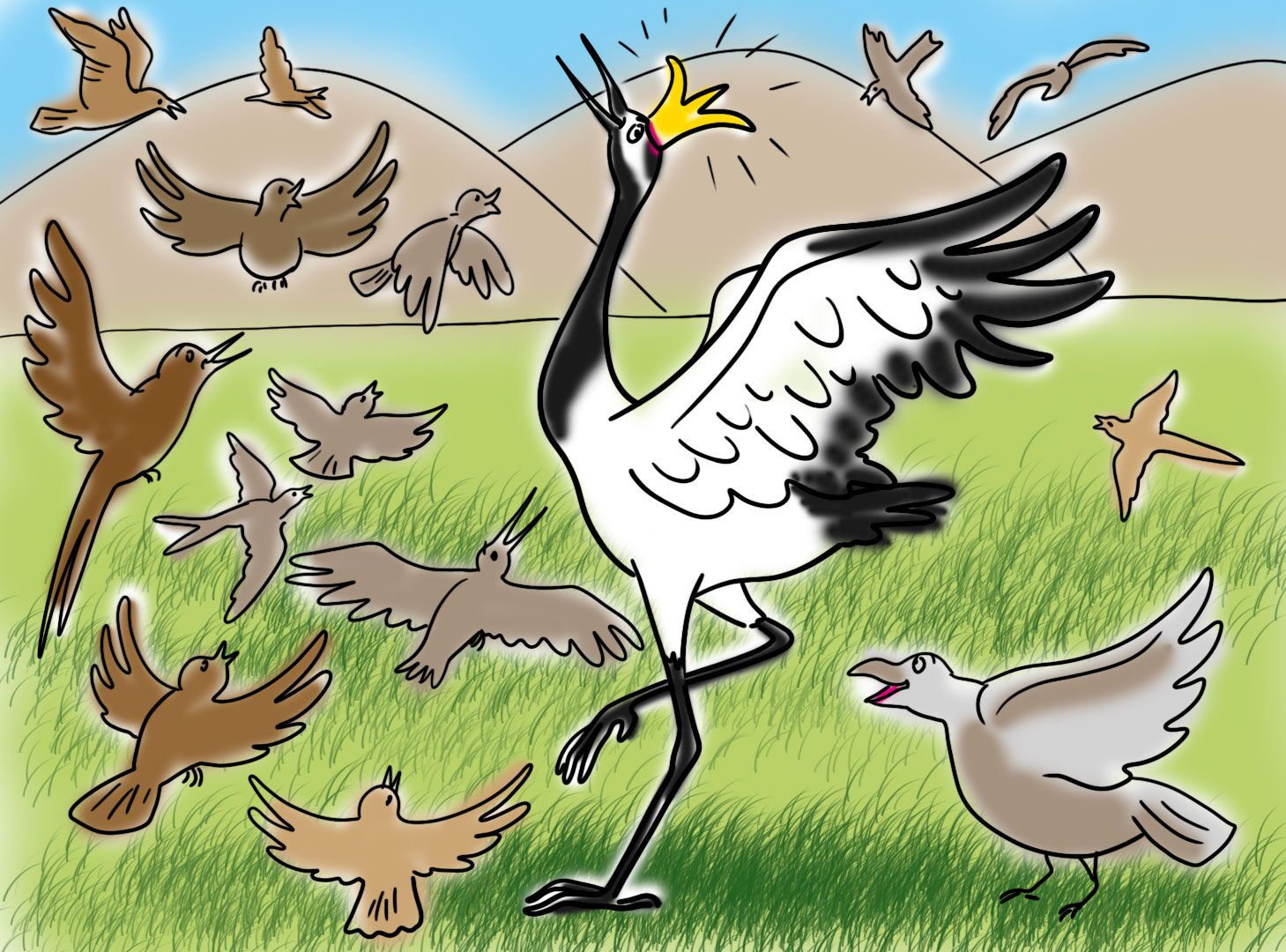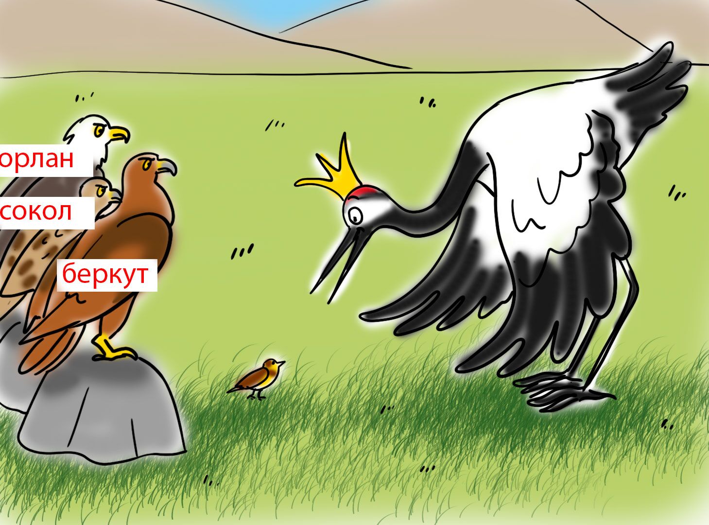 История о том, как царственный журавль плохо поступил с одной маленькой птичкой и чем это закончилось.