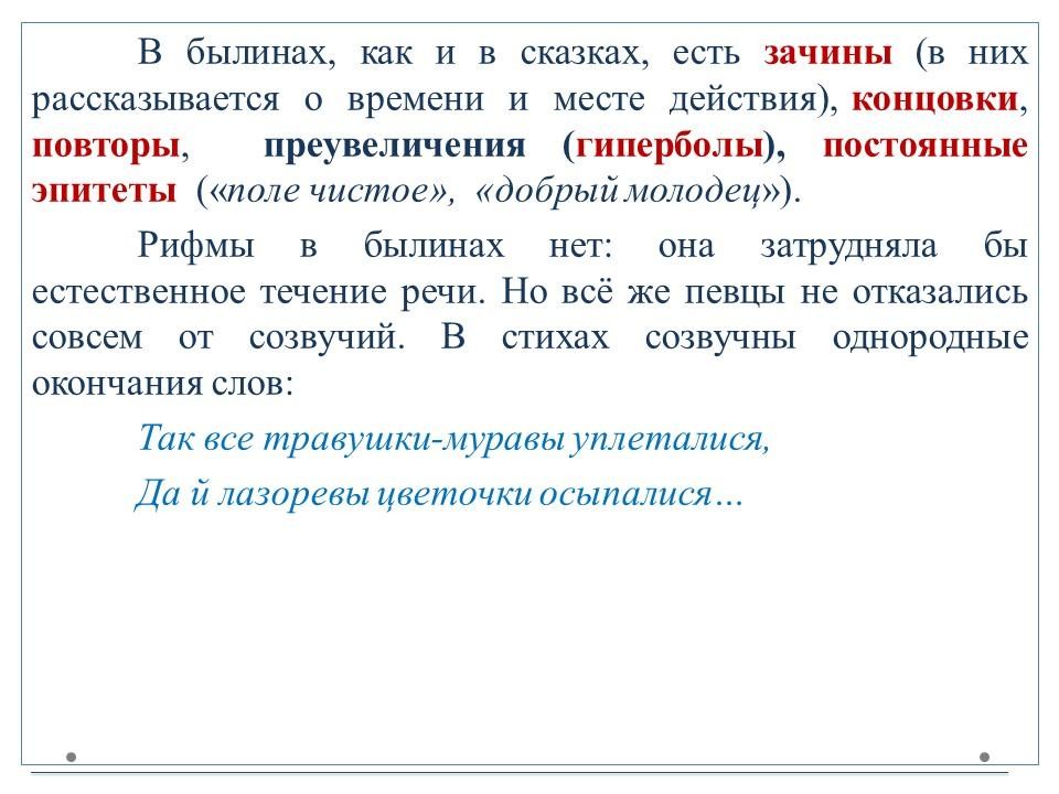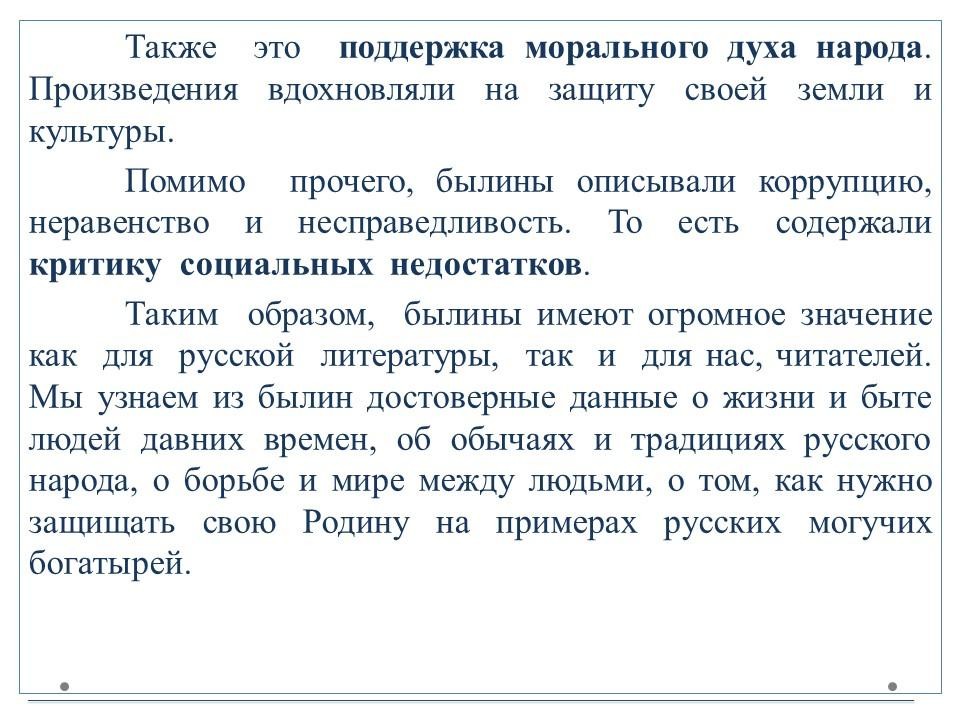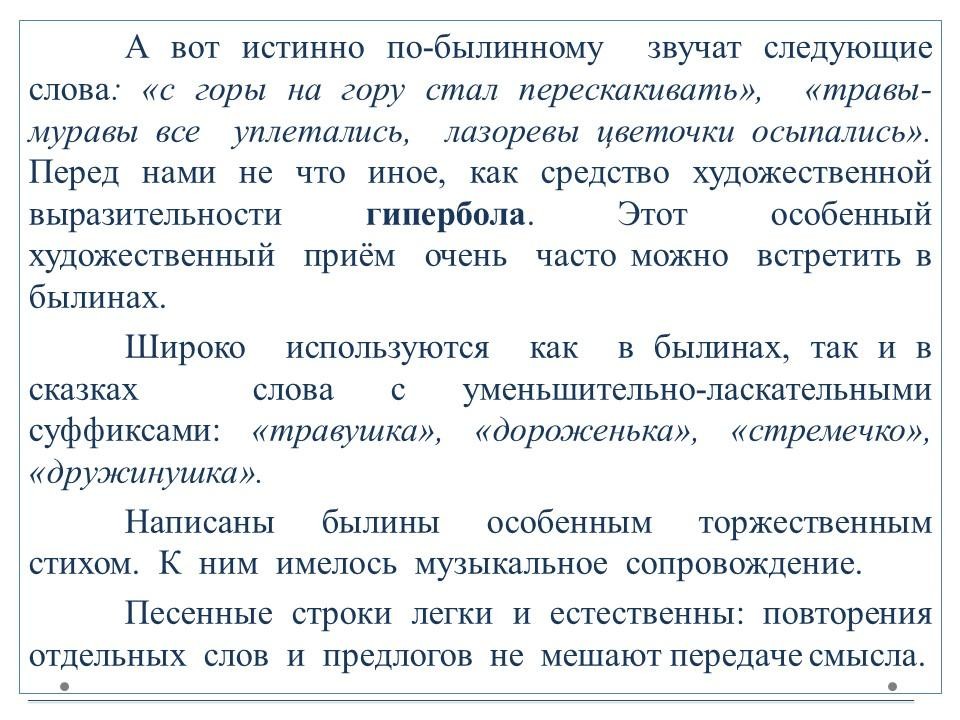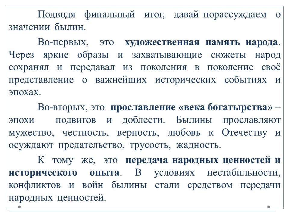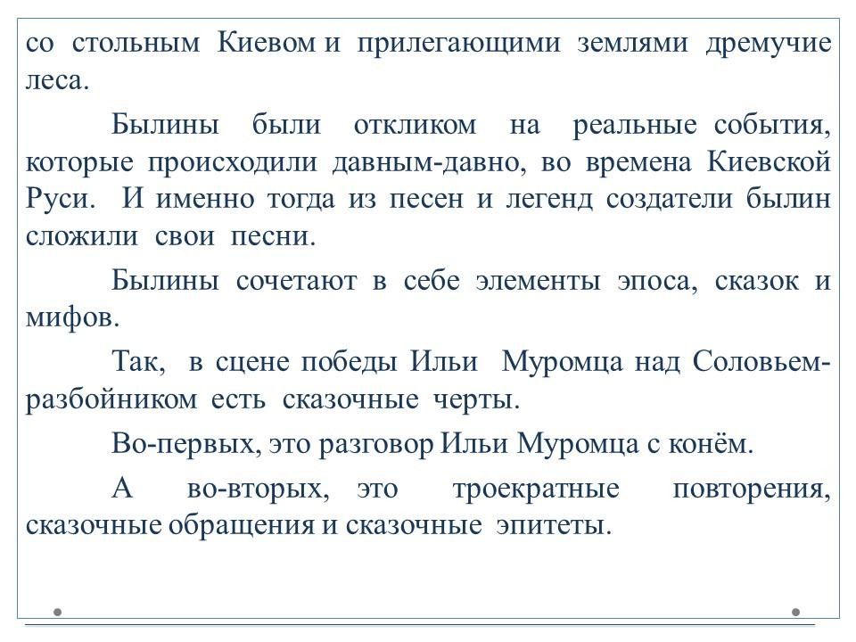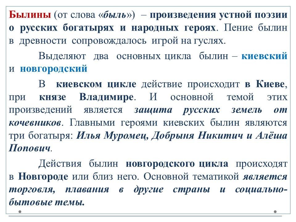 Былины (от слова «быль») – произведения устной поэзии о русских богатырях и народных героях. Пение былин в древности сопровождалось игрой на гуслях.Выделяют два основных цикла былин – киевский и новгородский. В киевском цикле действие происходит в Киеве, при князе Владимире.Основной темой этих произведений является защита русских земель от кочевников.Главными героями киевских былин являются три богатыря: Илья Муромец, Добрыня Никитич и Алёша Попович. Действия былин новгородского цикла происходят в Новгороде или близ него. Основной тематикой является торговля, плавания в другие страны и социально-бытовые темы.