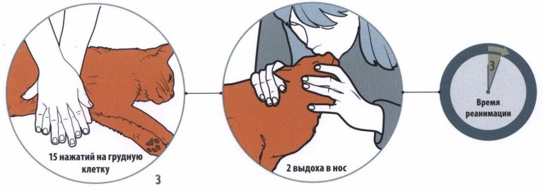 Если это не помогло ей прийти в себя:Проверьте сердцебиение кошки.Если сердце не бьется – нажимайте на грудную клетку за передними лапами. 2 раза в секунду.Каждый 15 нажатий дайте в нос кошке.Делайте так 3 минуты.Если кошка очнулась – сразу везите ее в клинику.