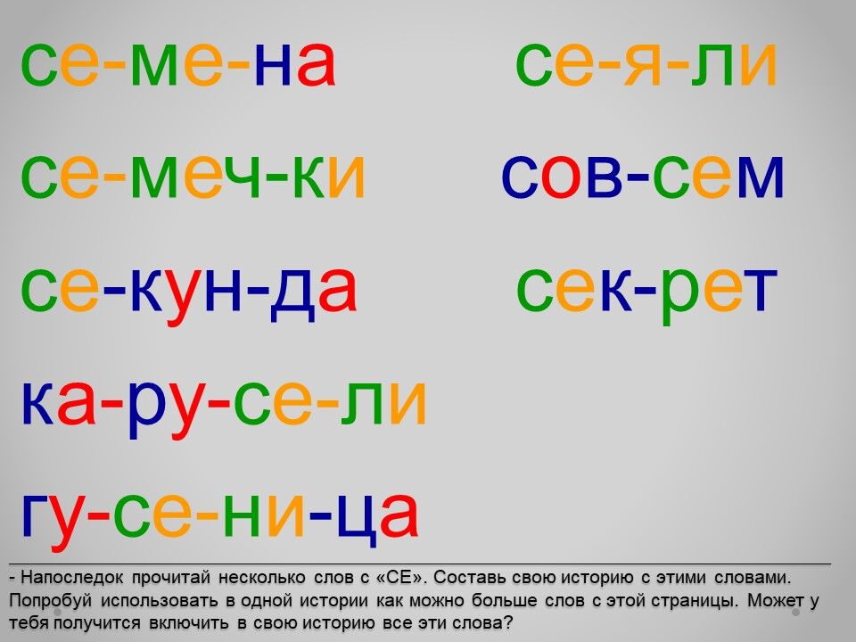 Электронный букварь с картинками – это надёжный, проверенный на нашем собственном опыте способ научить ребёнка читать. Букварь разработан опытным педагогом на основе многолетней практики. На этом уроке продолжаем изучать букву Е в открытых слогах. Изучаем Е в слоге СЕ.