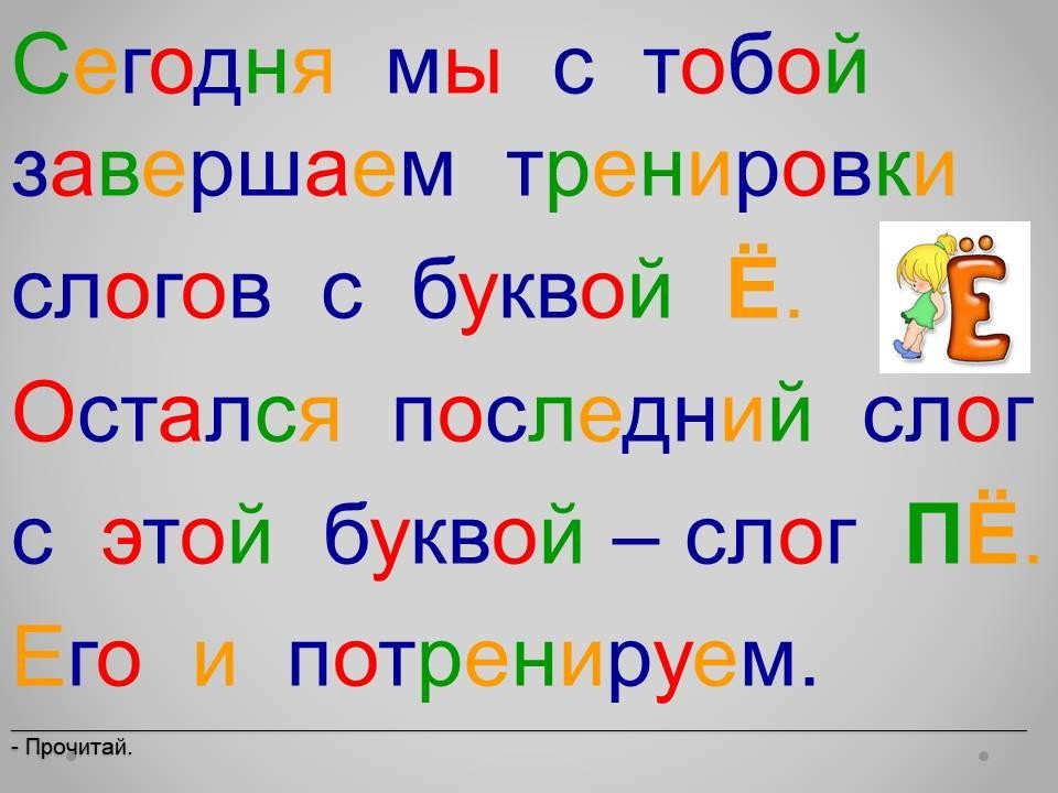 Электронный букварь с картинками – это надёжный, проверенный на нашем собственном опыте способ научить ребёнка читать. Букварь разработан опытным педагогом на основе многолетней практики. На этом уроке продолжаем изучать букву Ё в открытых слогах. Прорабатываем слог ПЁ.