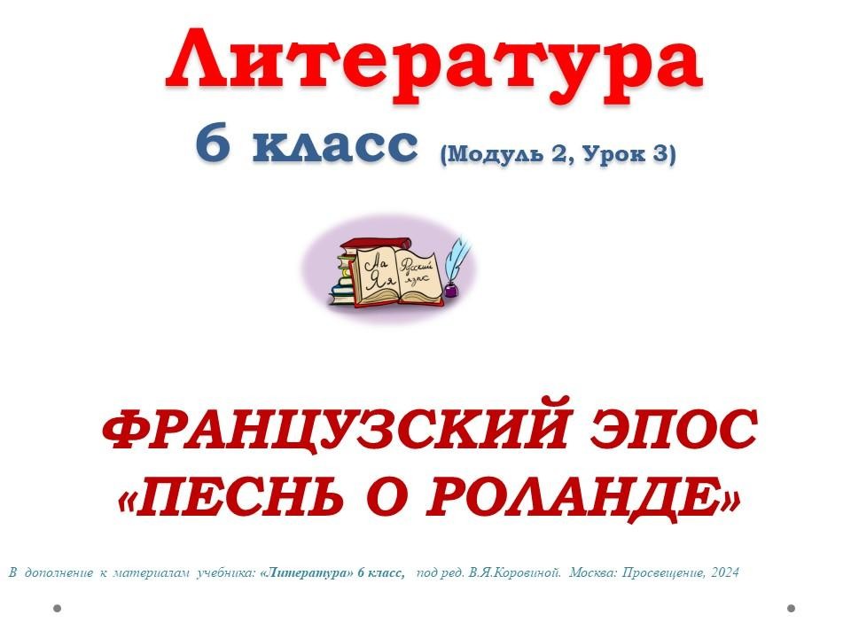 Из-за отказа Роланда затрубить в рог на него легла вина за смерть франков. Но эта вина объясняется отвагой героя, то есть вытекает из его привлекательных качеств, и потому своеволие богатыря Роланда не умаляет его любви к Родине и верности «милой Франции». Средневековый французский эпос по содержанию сходен и вместе с тем различен со средневековым русским эпосом. Например со «Словом о полку Игореве», которое вы будете изучать в 9 классе. Оба произведения близки дружинно-рыцарским идеалам. В них воссозданы картины сражений, подвиги героев, изображена военная жизнь. Герои эпических поэм предпочитают смерть плену или измене:Роланд: «Скорее смерть, чем срам!»;Игорь: «Луце жъ потяту быти, нежели полонену быти». Неудача Карла Великого по логике эпоса стала осознаваться как патриотический долг героев: «О, Франция, отчизна дорогая», «О, родина, о, Франция-краса!». В том же духе неудачное нападение Игоря на его недавних союзников — половцев переосмыслено: «О, Русская земля…», «За землю Русскую…». Великие идеи средневекового эпоса вдохновили и поэтов XX столетия. Например: Марина Цветаева написала стихотворение «Рог Роланда».