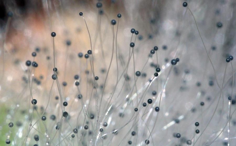 Если хлеб пролежит несколько дней в теплом или влажном месте, на нем появляется белый пушистый налет, который через некоторое время темнеет. Это плесневый гриб-сапрофит мукор. Этот гриб часто поселяется также на фруктах, овощах, на конском навозе. Грибница мукора состоит всего из одной сильно разросшейся и разветвленной клетки с множеством ядер в цитоплазме.Размножается мукор обрывками грибницы или спорами. Некоторые нити грибницы поднимаются вверх и расширяются на концах. В этих черных расширениях, похожих на головки, образуются споры. Эти головки называют спорангиями. После созревания спор головки лопаются, и споры разносятся ветром. Попав в благоприятные условия, они прорастают в грибницу.