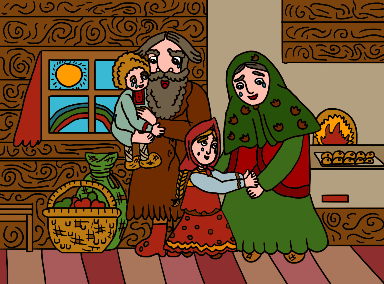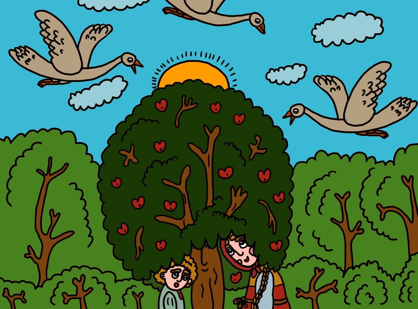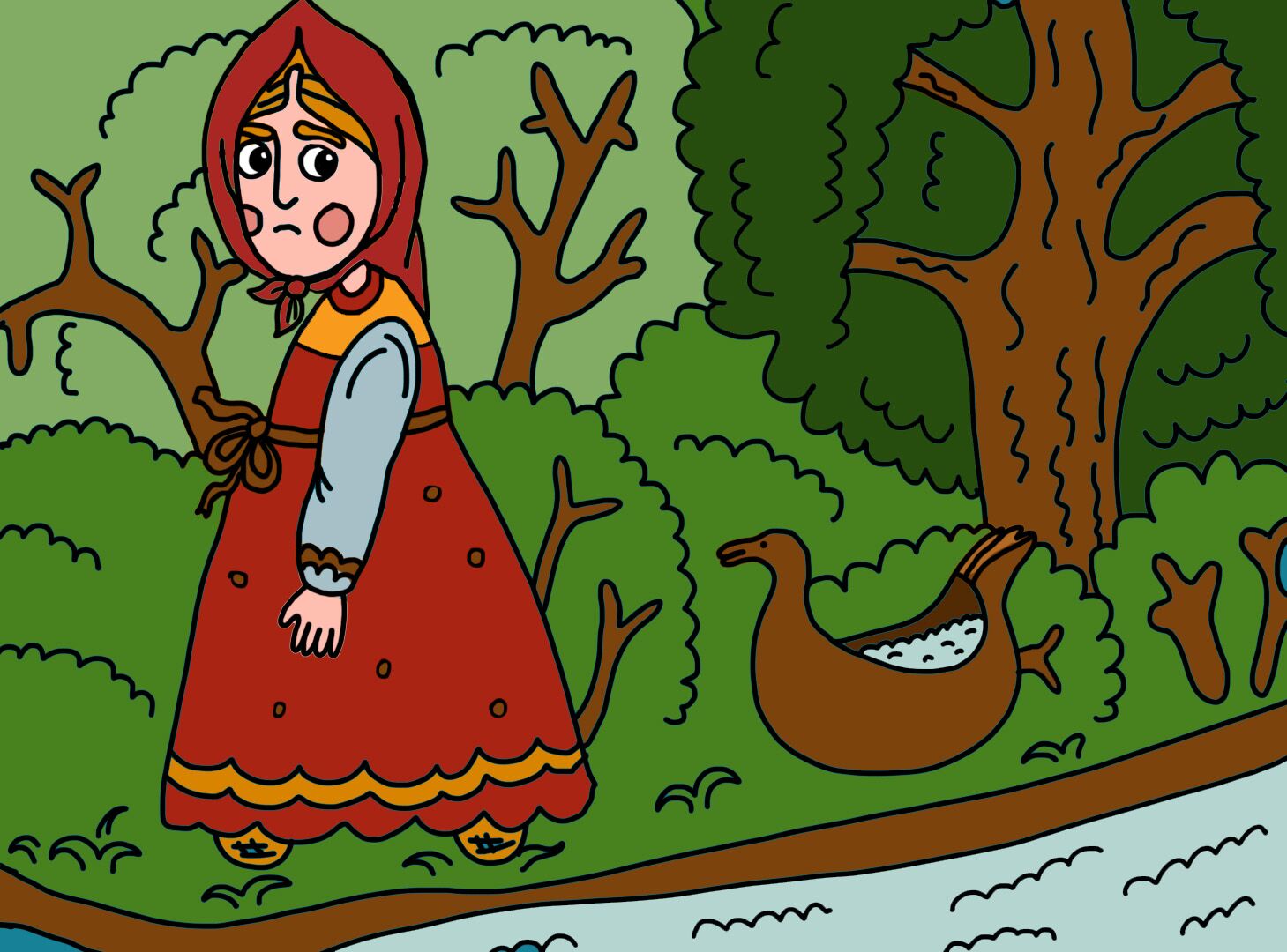 Старшая сестрица плохо присматривала за маленьким братиком. И того унесли злые гуси-лебеди. Пришлось девочке в тёмный лес отправиться, чтобы братца спасти.