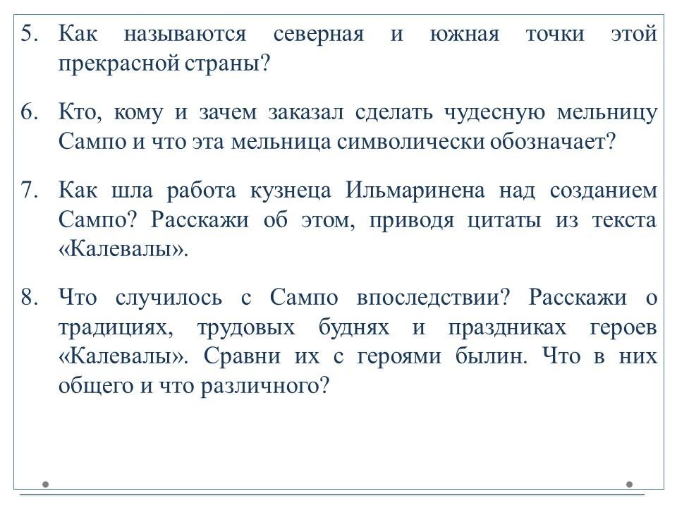 Вопрос №7:Как шла работа кузнеца Ильмаринена над созданием Сампо?Расскажи об этом, приводя цитаты из текста «Калевалы». Ответ:Работа кузнеца Ильматинена над созданием Сампо в эпосе «Калевала» описана подробно и сопровождается множеством образных деталей. Процесс создания Сампо происходил в несколько этапов. Каждый из этапов сопровождался определёнными трудностями. Вот как это описано в тексте. 1. Начало работы:Ильмаринен приступает к кузнечному делу, используя всё своё мастерство. В кузнице он разжигает огонь и начинает ковку. Он стремится создать нечто чудесное. Вот как это описано в «Калевале»: «Кузнец великий Ильмаринен Раздувал кузницу, разжигал огонь, Кузнечный мех наполнил яростным ветром, Стал ковку свою волшебную начинать.»