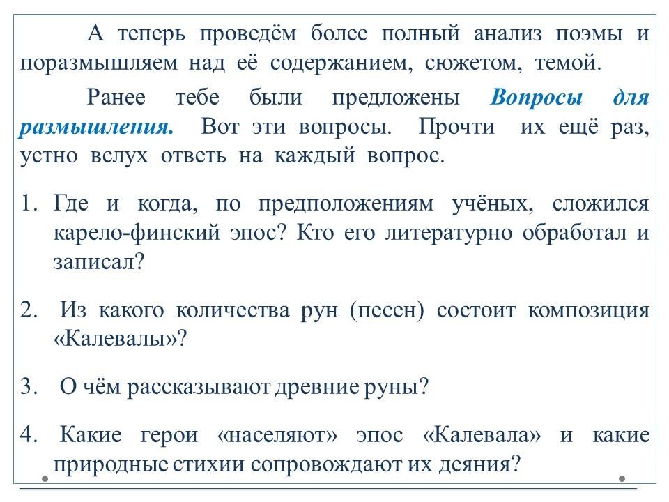Вопрос №3:О чём рассказывают древние руны? Дай развёрнутый ответ. Ответ: Древние руны, составляющие эпос «Калевала», рассказывают о мифических событиях и подвигах героев и отражают представления древних финно-угорских народов о мире, природе и человеческой жизни.Основные темы и сюжеты рун включают:1. Создание мира.Руны описывают миф о сотворении мира. Мир произошёл из яйца птицы. Согласно мифу, части яйца превращаются в различные элементы мира: небо, землю, солнце, луну и звёзды. 2. Герои и их подвиги.Центральные персонажи «Калевалы» - это великие герои, такие как Вяйнямёйнен, Ильмаринен и Лемминкяйнен.Вяйнямёйнен – мудрый старец, наделённый магической силой и знанием.Ильмаринен – искусный кузнец, который создаёт чудесные предметы, такие как волшебная мельница Сампо.Лемминкяйнен – герой-воин, совершающий подвиги ради своей возлюбленной.