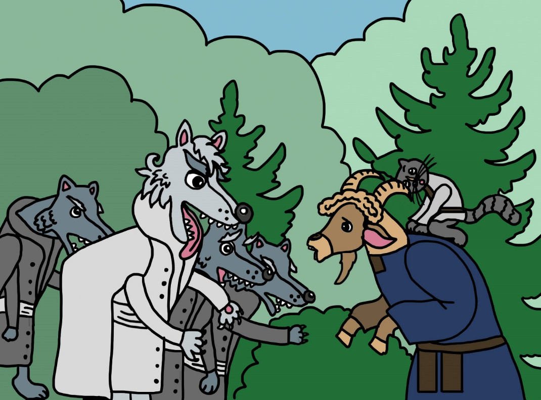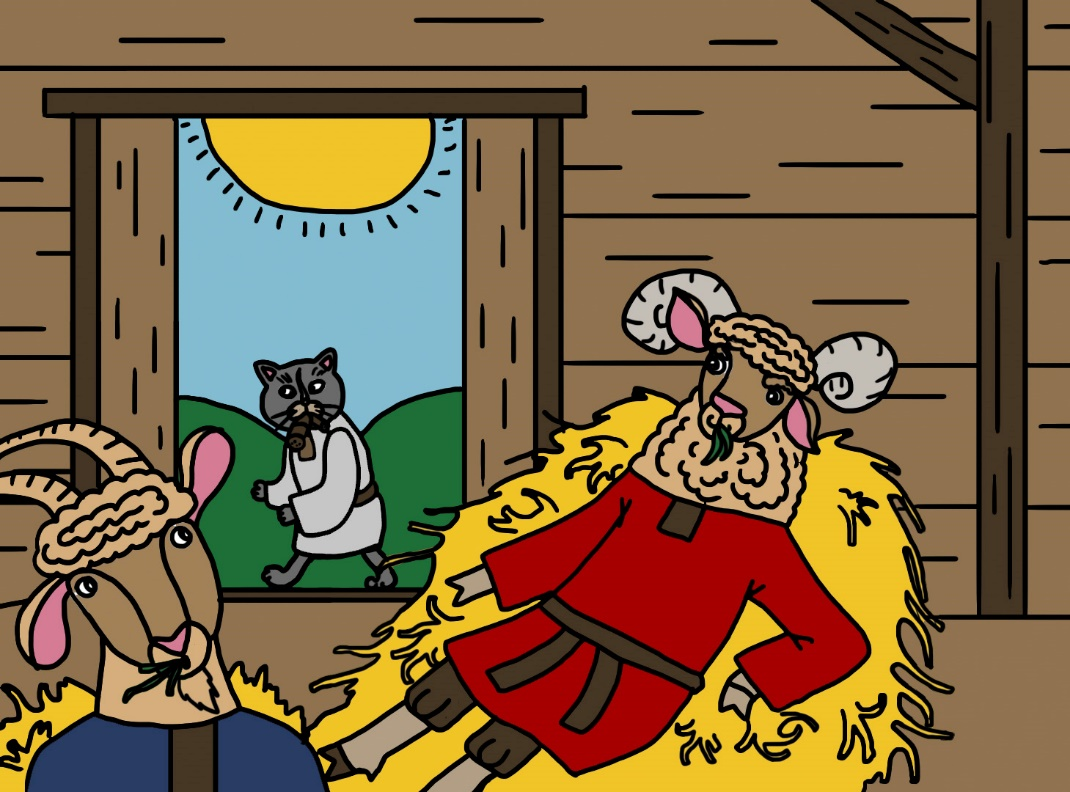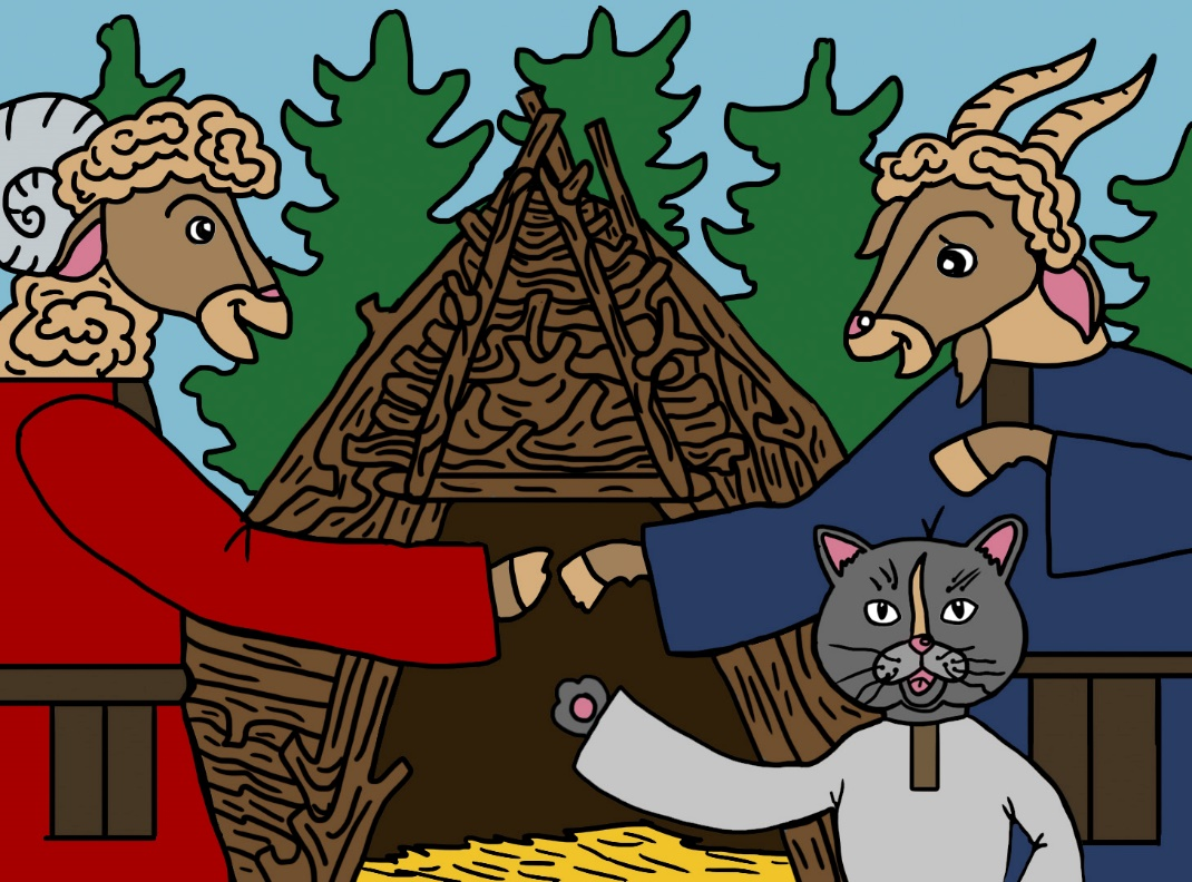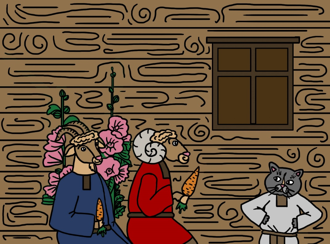 Кот, козёл да баран жили в деревне. Жили мирно, никого не трогали, пока однажды не навлёк кот на всех беду. Пришлось всем троим удрать из дому, а в лесу жизнь суровая, бродят хищники...