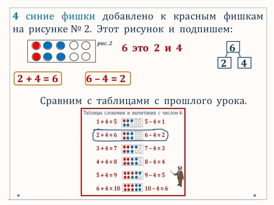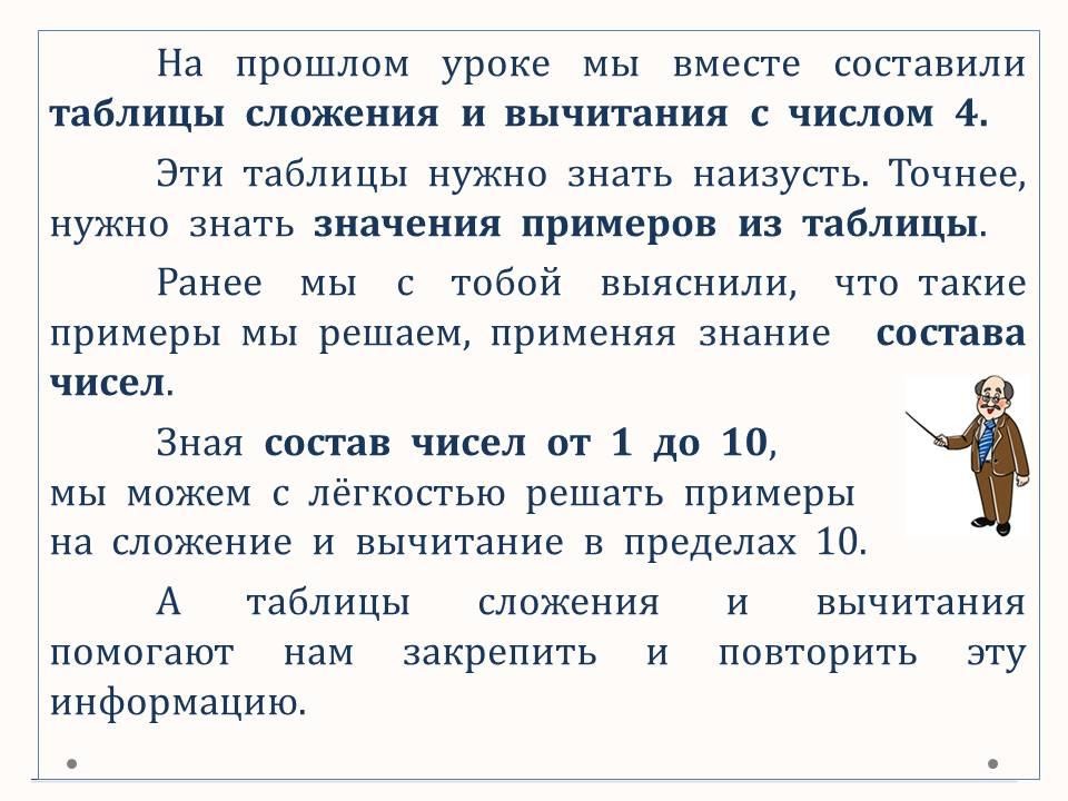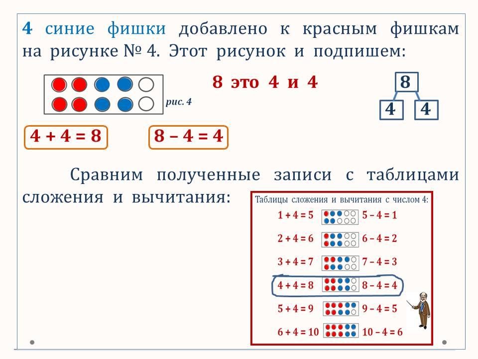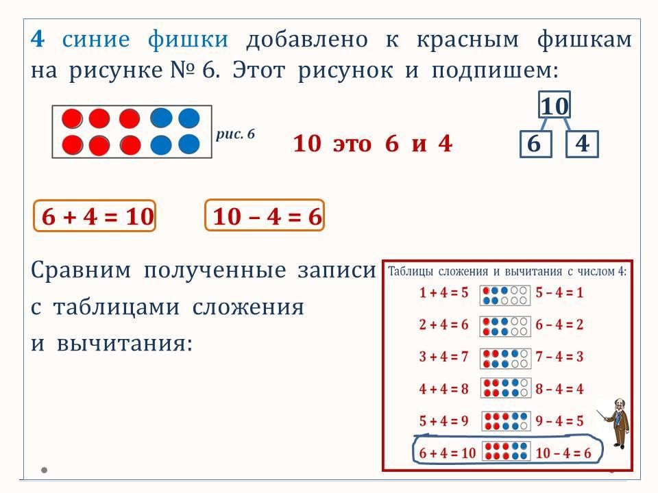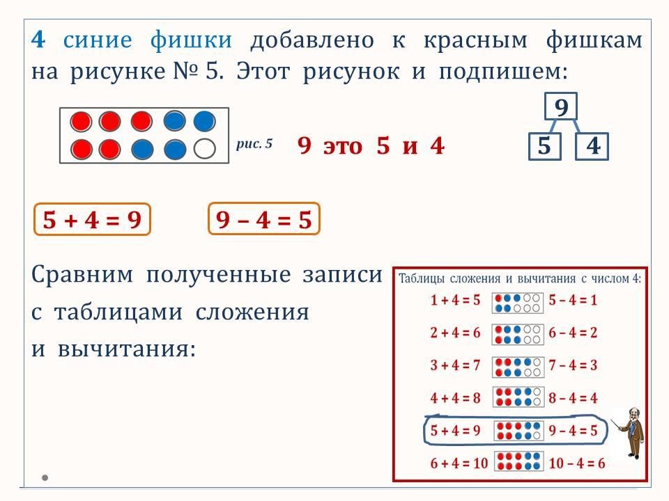 Программа 1 класса ОШ. В данном уроке подкрепляем таблицы сложения и вычитания с числом 4 знаниями состава чисел первого десятка.