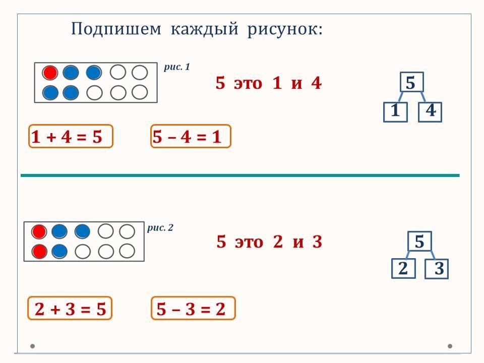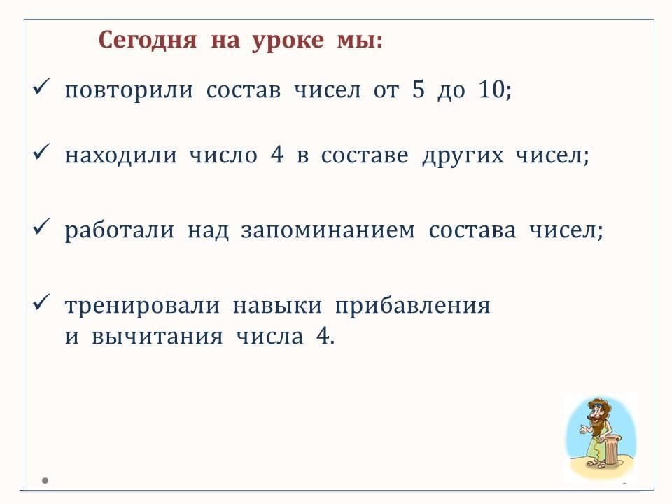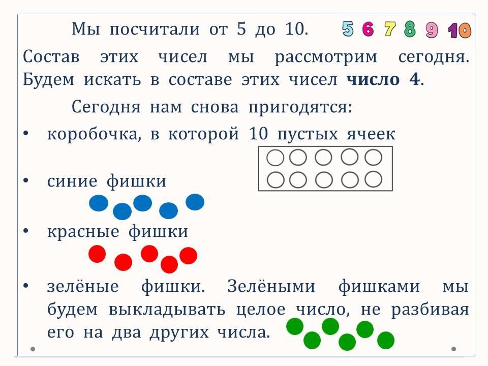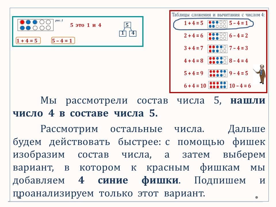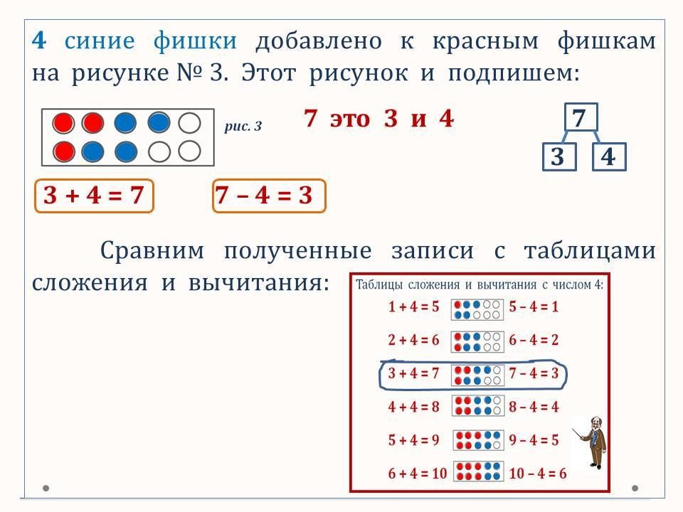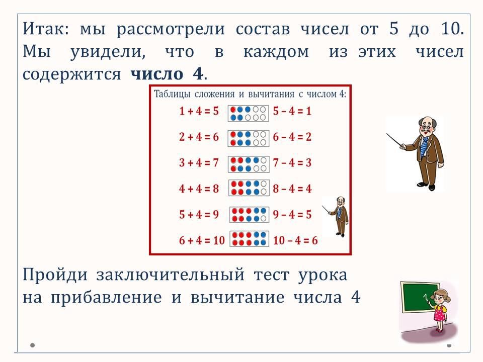 Программа 1 класса ОШ. В данном уроке подкрепляем таблицы сложения и вычитания с числом 4 знаниями состава чисел первого десятка.