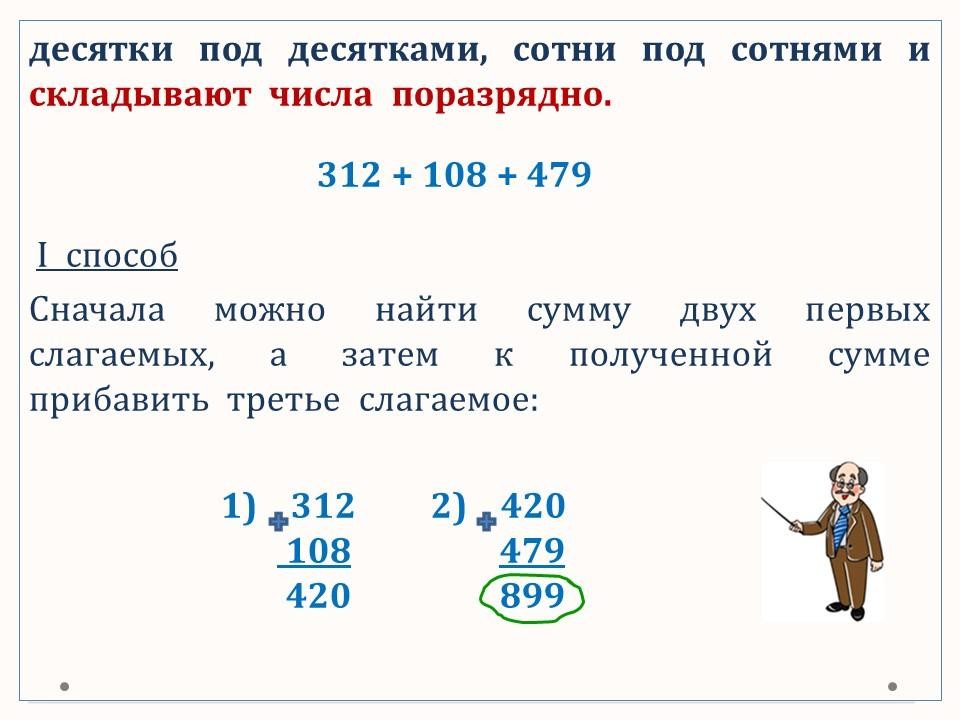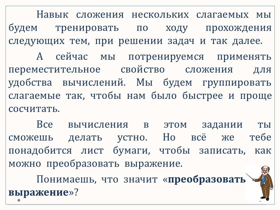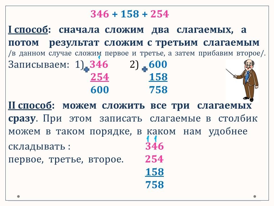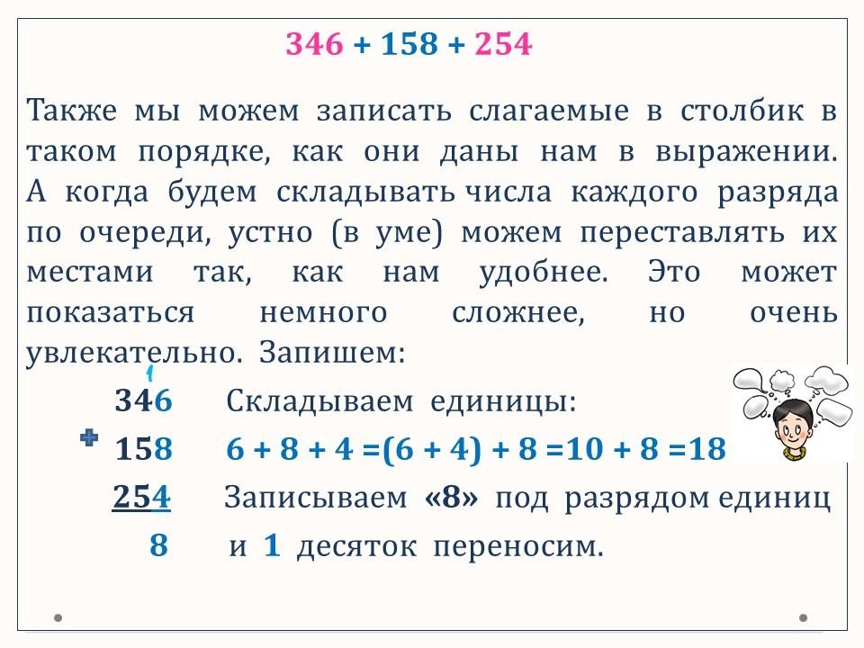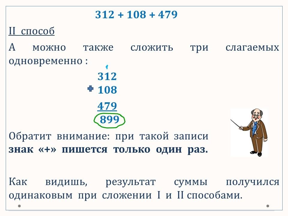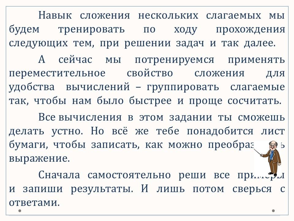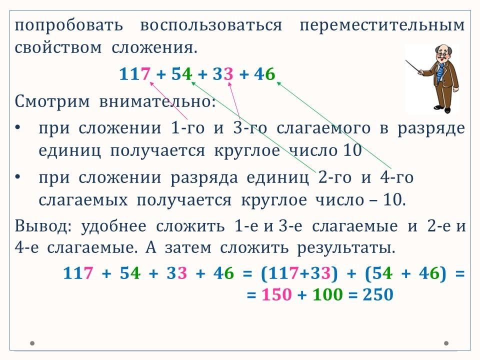 В данном уроке тренируемся находить сумму нескольких слагаемых разными способами. Вспоминаем переместительное свойство сложения.
