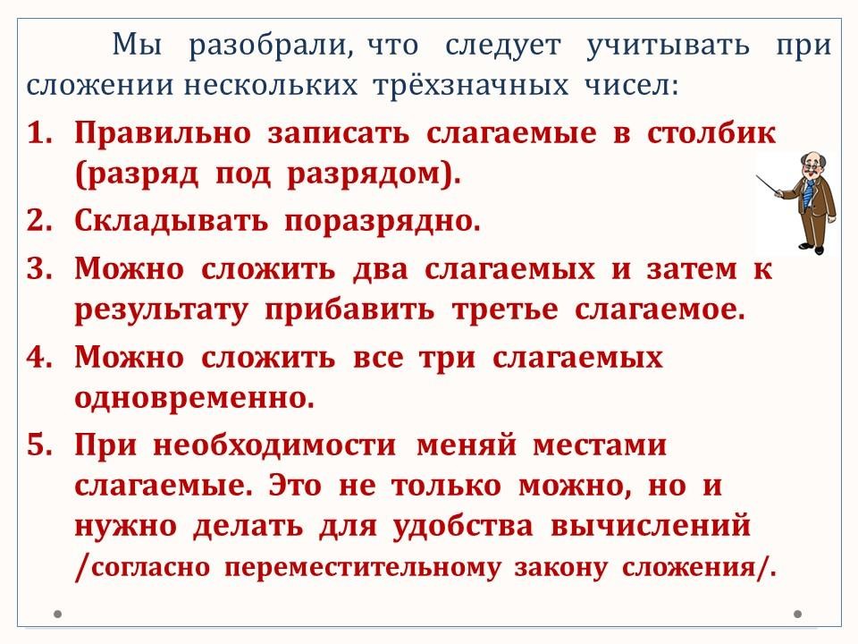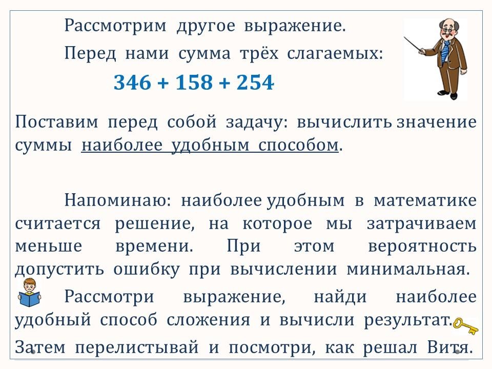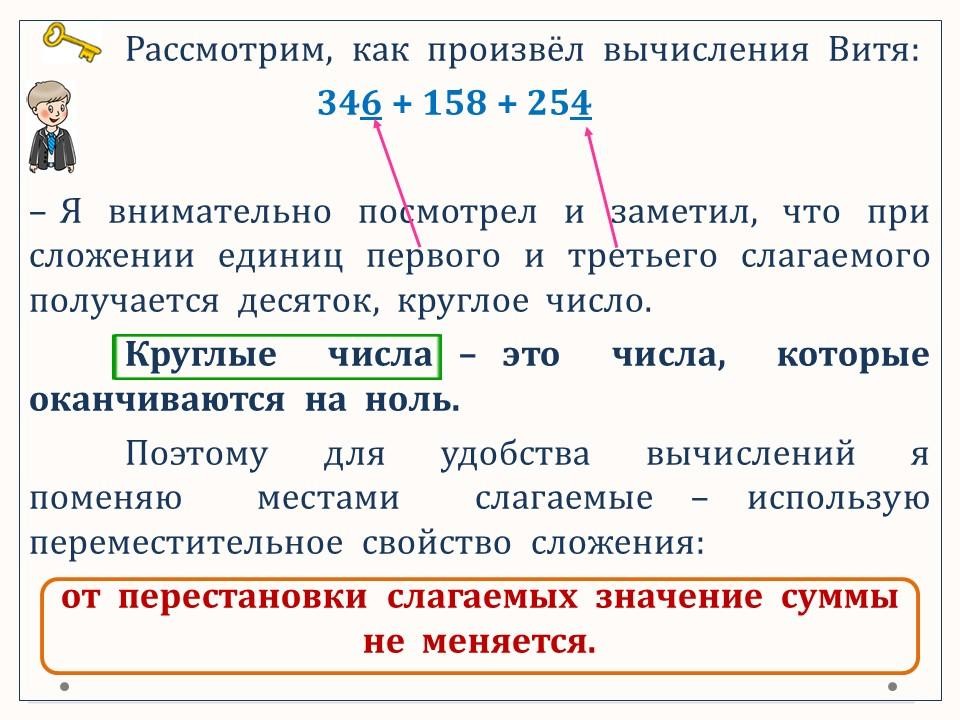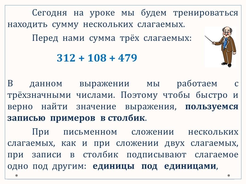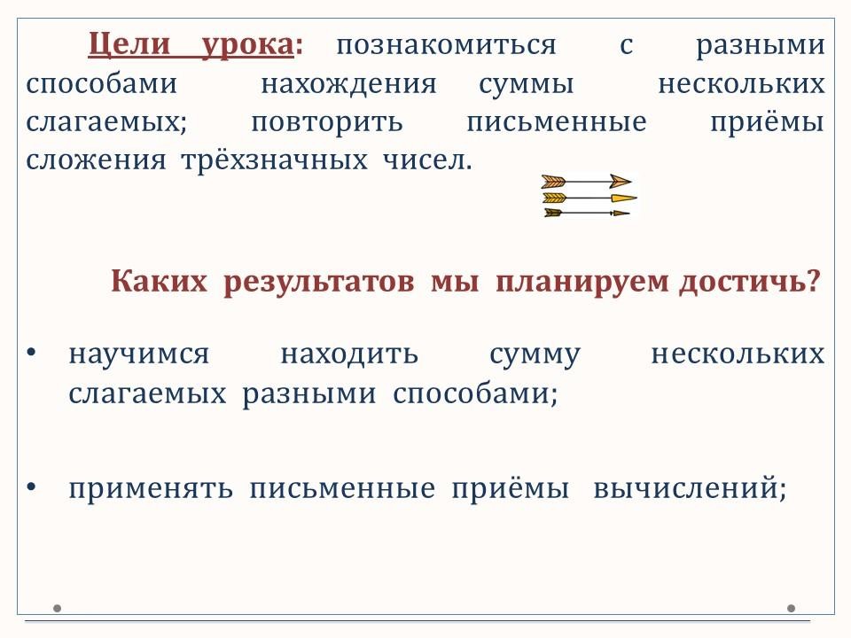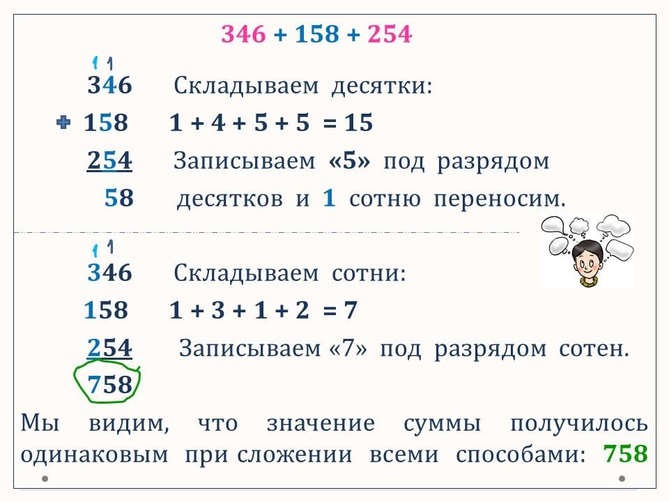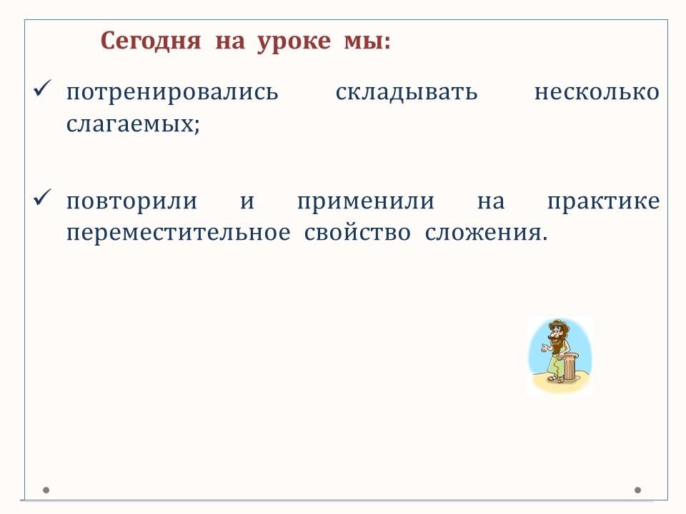В данном уроке тренируемся находить сумму нескольких слагаемых разными способами. Вспоминаем переместительное свойство сложения.