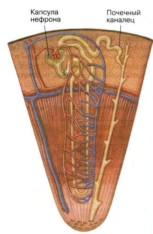 Каждая почка состоит приблизительно из 1 млн нефронов. Нефрон является функциональной единицей почки и может обеспечивать процесс фильтрации, однако концентрирование мочи происходит только при совместной работе многих нефронов. Отдельный нефрон состоит из капсулы и почечного канальца.Капсулы нефронов расположены в корковом слое почки и представляют собой микроскопическую чашечку из двух слоёв эпителиальных клеток, между которыми имеется щелевидное пространство, дающее начало почечному канальцу. Внутри капсулы расположен клубочек кровеносных капилляров, образующийся в результате многократного ветвления почечной артерии, несущей кровь в почки. Почечная артерия отходит от аорты, давление в ней очень велико, и за 45 мин через почки проходит вся кровь организма человека.