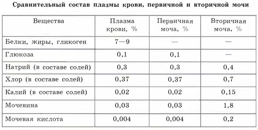 За счёт высокого давления крови в клубочковых капиллярах вода и небольшие молекулы различных веществ, содержащиеся в плазме крови, проходят через тонкие однослойные стенки и попадают в щелевидное пространство капсулы, от которой начинается почечный канал. Образовавшийся при этом раствор называют первичной мочой. По составу первичная моча близка к лишённой белков плазме крови. Белки из-за большого размера молекул не могут попасть в просвет капсулы. Первичная моча содержит мочевину, сахара, витамины, минеральные соли, аминокислоты. Таким образом, большая часть компонентов первичной мочи необходима организму и не должна удаляться из него. Из просвета капсул первичная моча движется по извитому канальцу, стенки которого способны к обратному всасыванию большинства веществ, содержащихся в первичной моче. При этом из первичной мочи обратно в кровь, проходящую по капиллярам, оплетающим извитые канальцы, поступают вода, соли натрия и калия, глюкоза, витамины, аминокислоты, то есть те вещества, которые организм может использовать в процессах обмена и терять которые было бы опасно для здоровья. В результате концентрирования из первичной мочи в канальцах образуется вторичная моча, которая содержит 98% воды, 1,8% мочевины, 0,2% мочевой кислоты и некоторые минеральные соли. За сутки у здорового человека образуется 1, 7-2,0 л вторичной мочи, что составляет примерно 10% объёма первичной мочи. Процессы образования мочи требуют больших энергетических затрат - около 10% всей энергии организма. По собирательным трубкам вторичная моча попадает в почечные лоханки и далее по мочеточникам в мочевой пузырь.