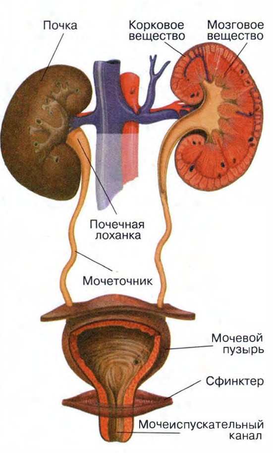 В анатомии человека органы мочевыделения относят к мочевыделительной системе. Среди органов мочевыделения различают: почки, мочеточники, мочевой пузырь и мочеиспускательный каналПочки - парные бобовидные органы, расположенные у задней стенки брюшной полости на уровне 1-го и 2-го поясничных позвонков. Масса каждой почки приблизительно равна 150 г. Длина почки в среднем 12 см. Почки прикреплены к брюшной стенке слоем соединительной ткани таким образом, что располагаются по обе стороны позвоночника, над поясницей, позади печени и желудка. Снаружи каждая почка покрыта оболочками из соединительной и жировой ткани. Почка состоит из двух слоёв: более тёмного наружного коркового и более светлого внутреннего мозгового. Вогнутый край почки обращён к позвоночнику. В этом месте в почку входят и выходят из неё кровеносные сосуды. В этом же месте в почке находится полость, называемая почечной лоханкой. От почечной лоханки каждой почки отходит мочеточник, соединяющий почку с мочевым пузырём.