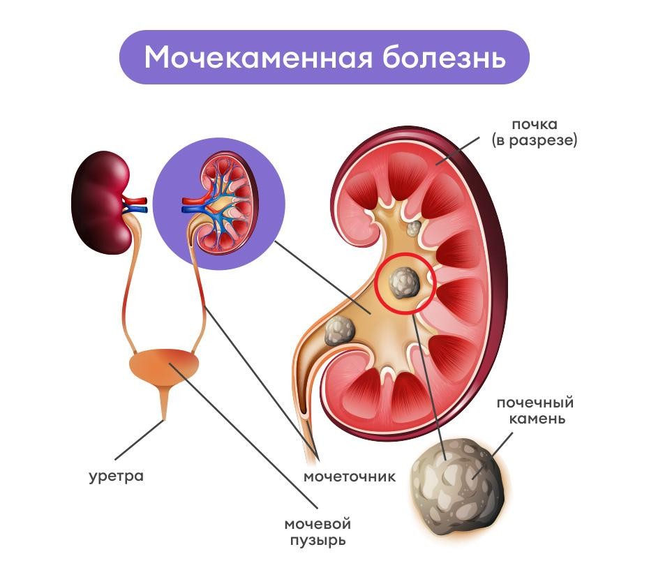 Нарушения работы почек приводят к изменению состава внутренней среды организма. При этом нарушается течение многочисленных реакций обмена веществ, что приводит к сбою в работе всех органов и систем организма и вызывает опасность для жизни человека. Если поражённые болезнью почки производят мало мочи, то вода задерживается в организме и возникают отёки. Через почки многократно проходят все вещества, находящиеся в крови, в том числе и те, которые могут разрушать капсулы нефронов: уксус, алкоголь, поваренная соль. Одно из заболеваний органов мочевыделения - мочекаменная болезнь. Камни - это твёрдые тела, которые могут образовываться в почках или мочевом пузыре, что приводит к возникновению болей, кровотечениям, воспалению, нарушениям оттока мочи.