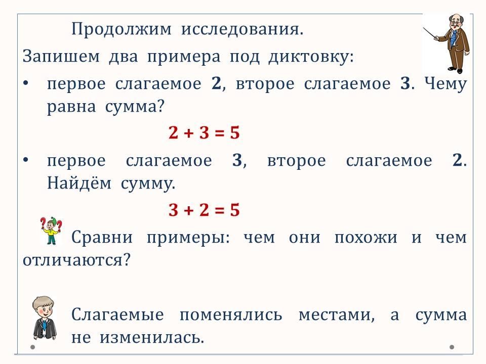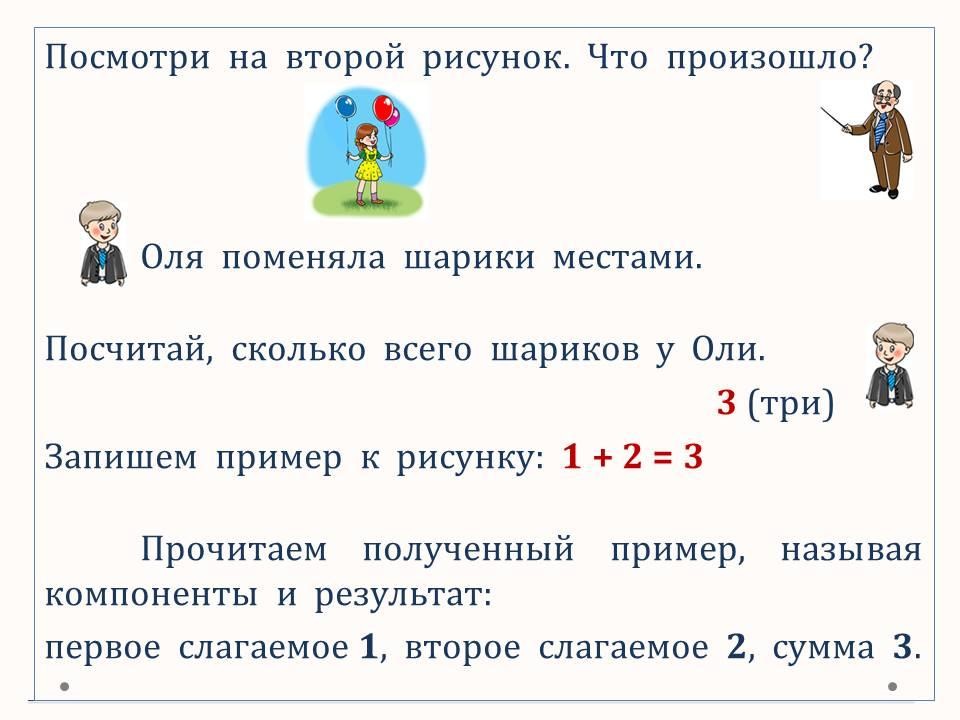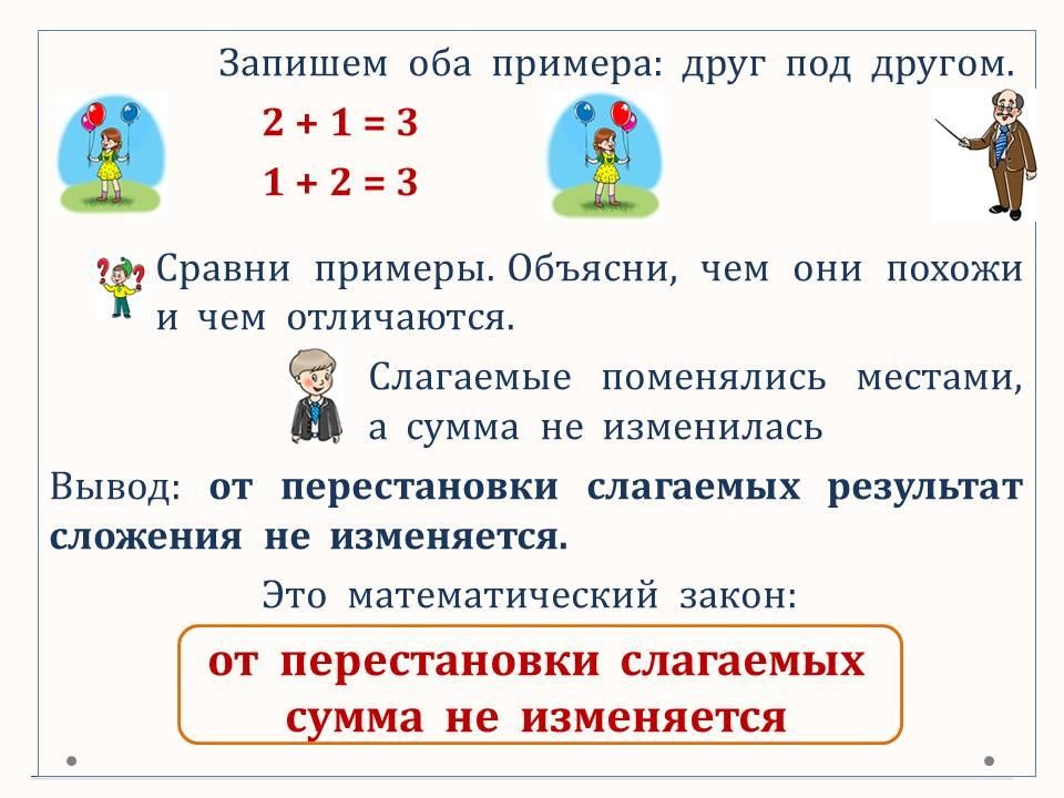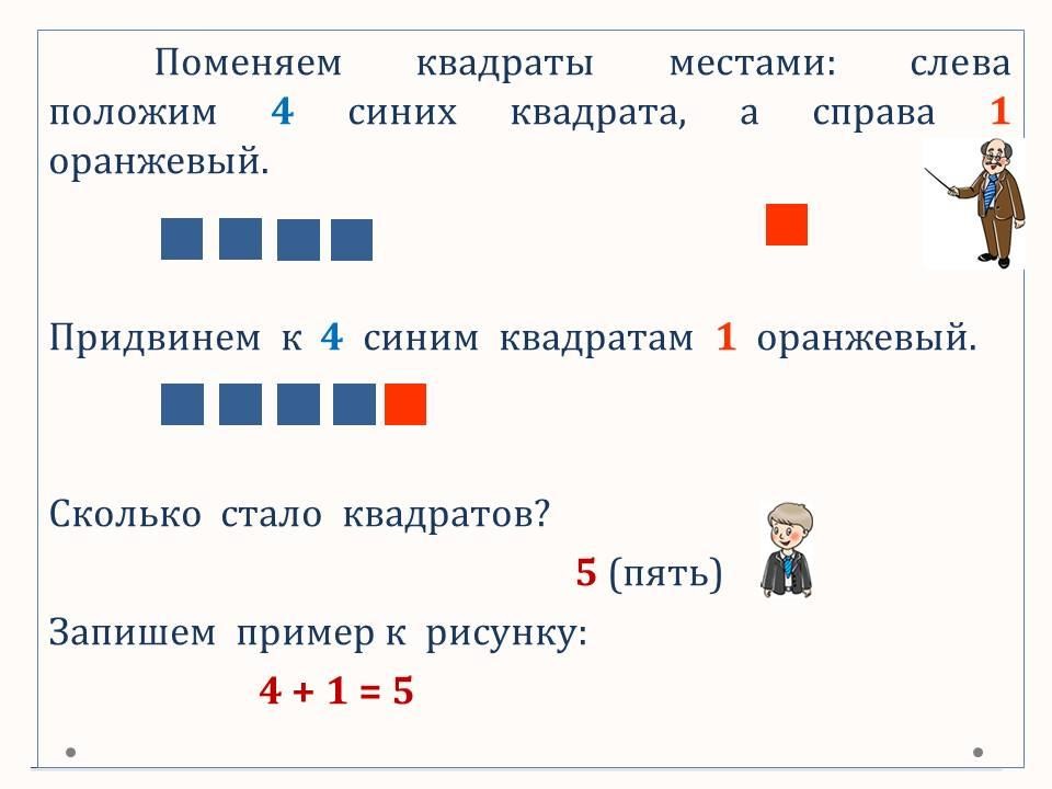 Программа 1 класса ОШ. В данном уроке в ходе наблюдений выводим переместительный закон сложения