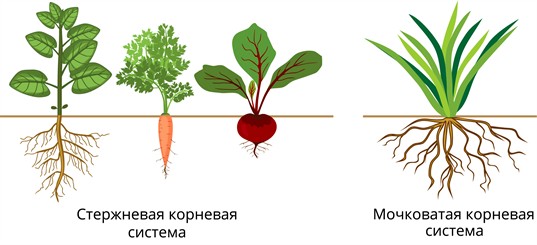 Все корни одного растения образуют корневую систему.Различают два типа корневых систем — стержневую и мочковатую.