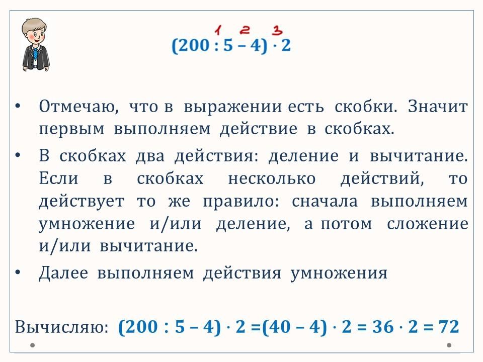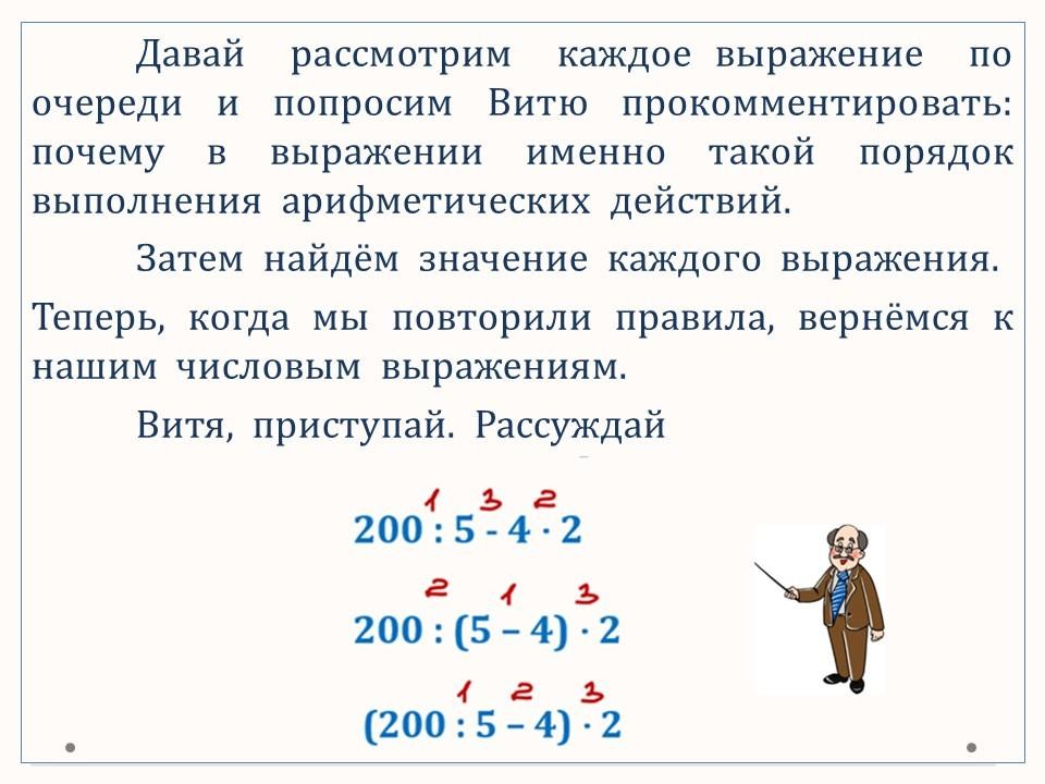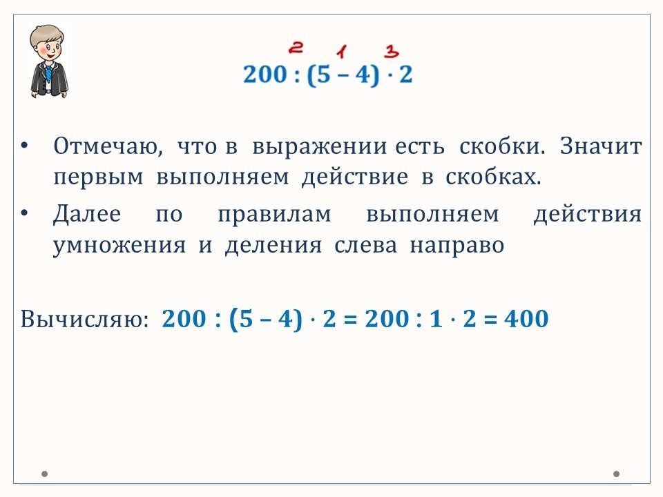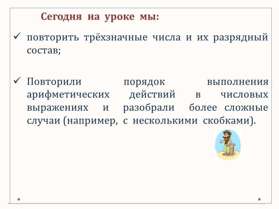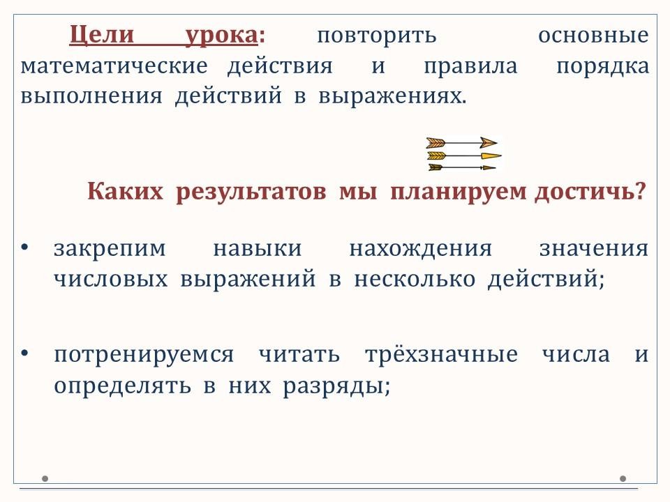 В данном уроке закрепляем знания о трёхзначных числах, а также повторяем правила порядка выполнения арифметических действий; рассматриваем более сложные числовые выражения