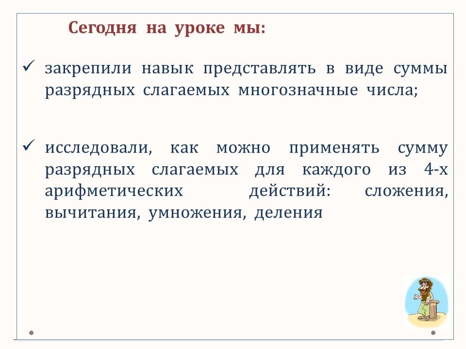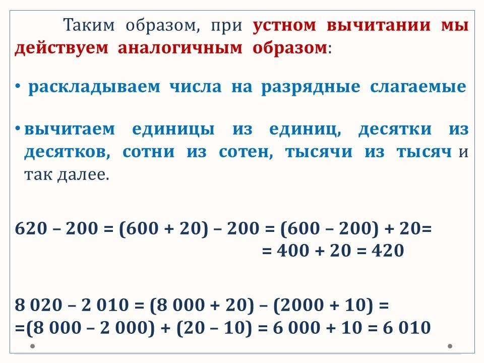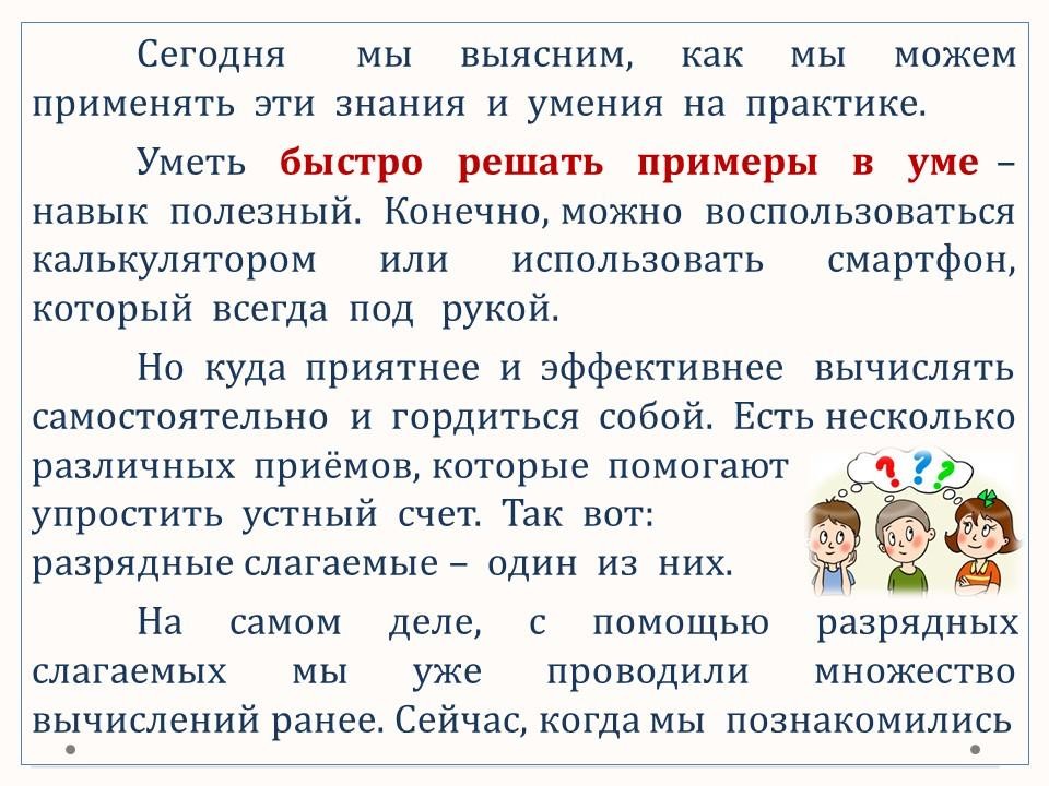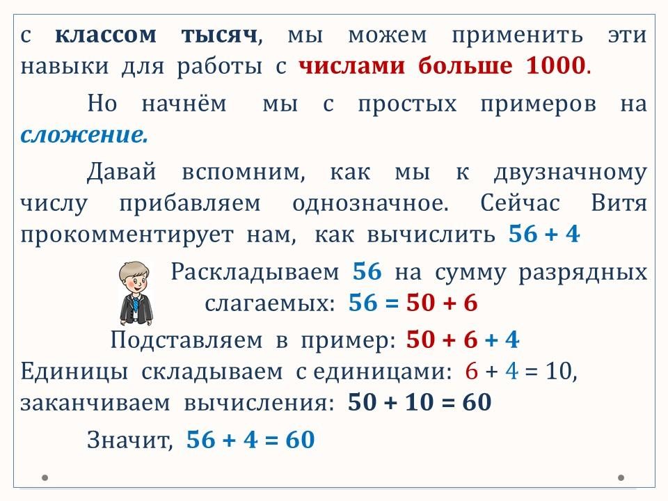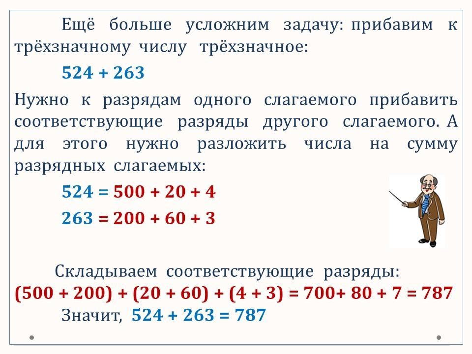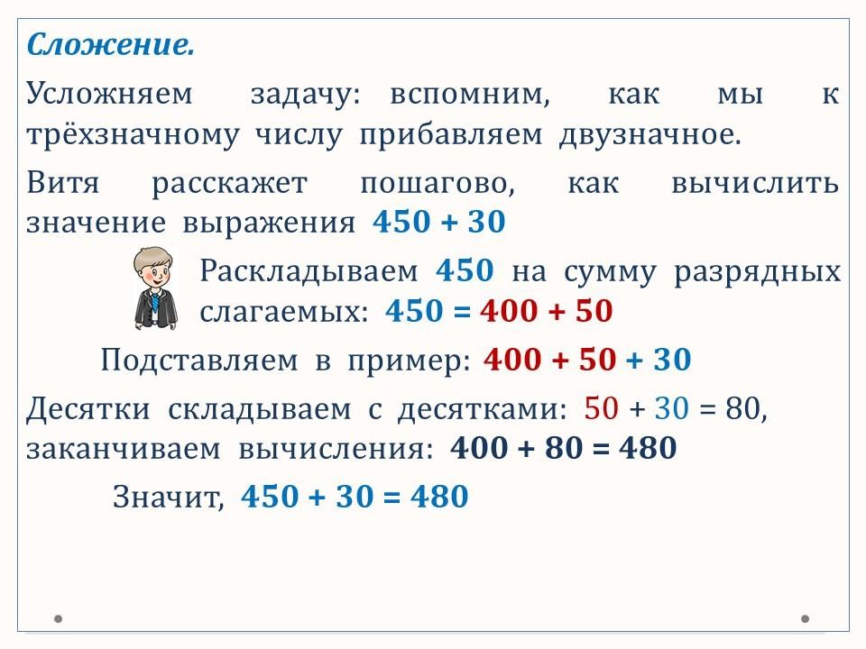 Продолжаем тренировать умение представлять многозначные числа в виде суммы разрядных слагаемых и учимся применять этот навык на практике для устных вычислений.