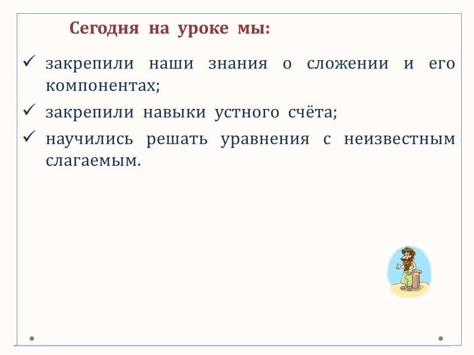 В данном уроке мы научимся решать уравнения с неизвестным слагаемым, применяя наши знания о связи компонентов сложения и вычитания