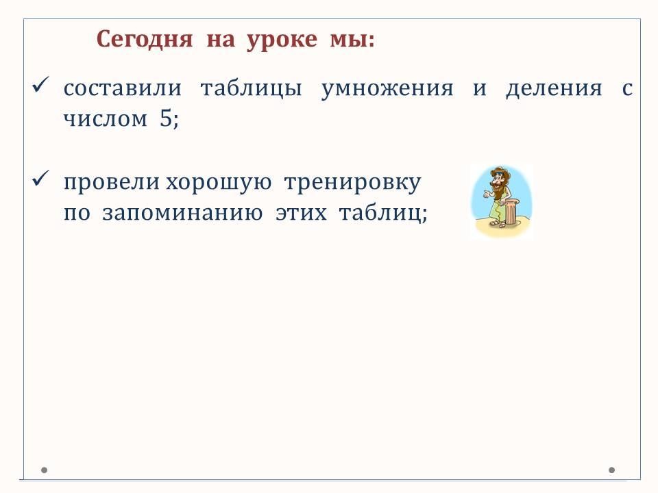 Программа 3 класса ОШ. В данном уроке составляем таблицы умножения и деления с числом 5. Работаем над запоминанием этих таблиц.