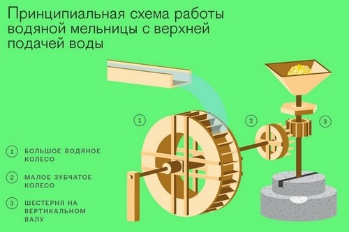 Принцип действия водяной мельницы. Вода льётся на лопатки большого водяного колеса (1). Колесо вертится вместе с горизонтальным валом и малым зубчатым колесом (2). Малое зубчатое колесо вращает шестерню (3) вместе с вертикальным валом. На вертикальном валу закреплены каменные жернова, которые вращаются и мелят зерно.