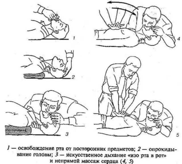 Если сердце не бьётся, то надо сочетать искусственное дыхание с непрямым массажем сердца: после одного вдувания воздуха в лёгкие производят 4-5 быстрых толчкообразных надавливаний на нижнюю треть грудины. Грудину смещают у взрослых на 45 см, а у детей младшего возраста - на 1,52 см в ритме 80-90 надавливаний в минуту. После 4-5 надавливаний вновь следует вдувать воздух в рот или нос пострадавшего. Меры по оживлению можно считать успешными, если у пострадавшего сузились зрачки, порозовела кожа, появился пульс. Оказание первой помощи нельзя прекращать до тех пор, пока человек не станет самостоятельно дышать и не придёт в сознание. Затем пострадавшего следует отправить в лечебное учреждение. Для оказания помощи при отравлении угарным газом пострадавшего следует быстро вынести на свежий воздух, напоить горячим чаем. Если же угоревший потерял сознание и его дыхание остановилась, то необходимо применить искусственное дыхание. Если приходится оказывать первую помощь утонувшему, то прежде всего следует как можно быстрее удалить воду из воздухоносных путей и лёгких. Для этого спасатель, стоя на одном колене, укладывает пострадавшего себе на бедро так, чтобы его голова и верхняя часть туловища свисали вниз. Далее утонувшему открывают рот и, похлопывая его по спине, удаляют воду из дыхательных путей. Затем пострадавшего кладут на спину, подложив под спину валик из одежды, и начинают делать искусственное дыхание до появления самостоятельного дыхания и возвращения сознания. После этого человека надо напоить горячим чаем, укутать чем-нибудь тёплым и отправить в больницу